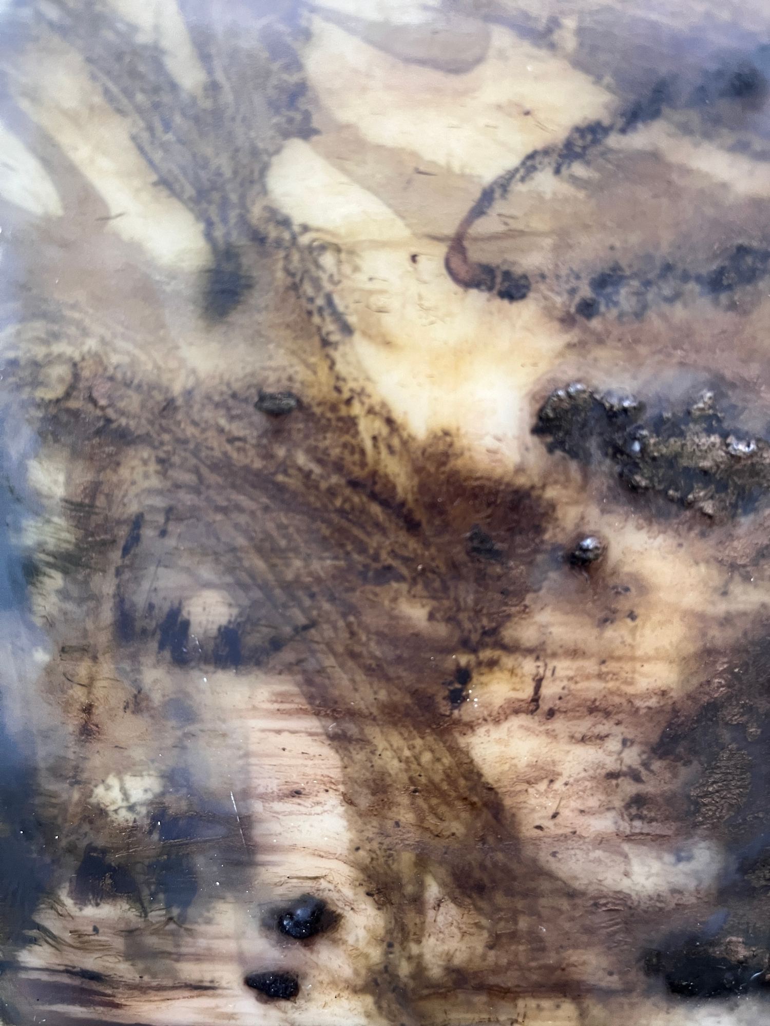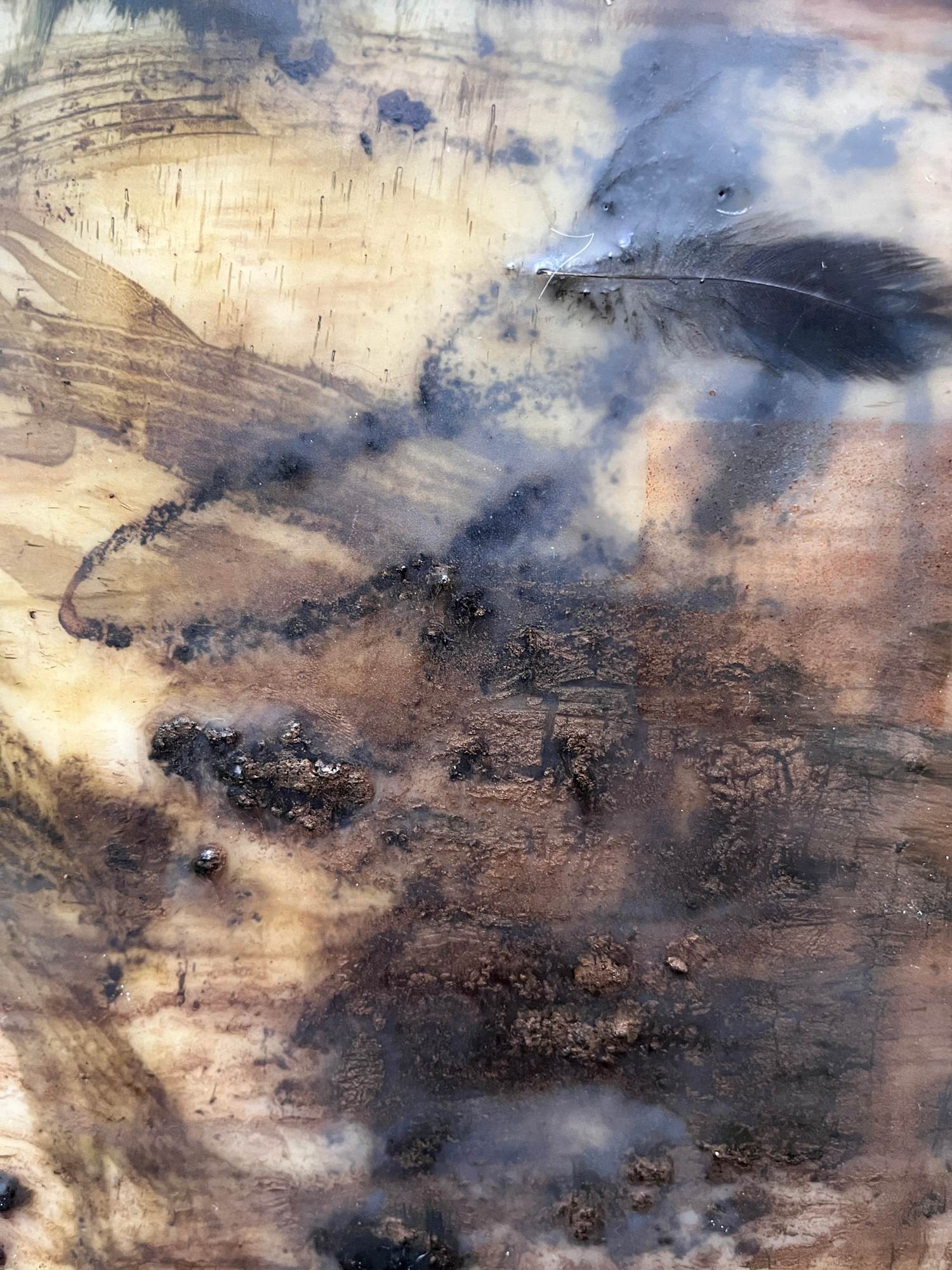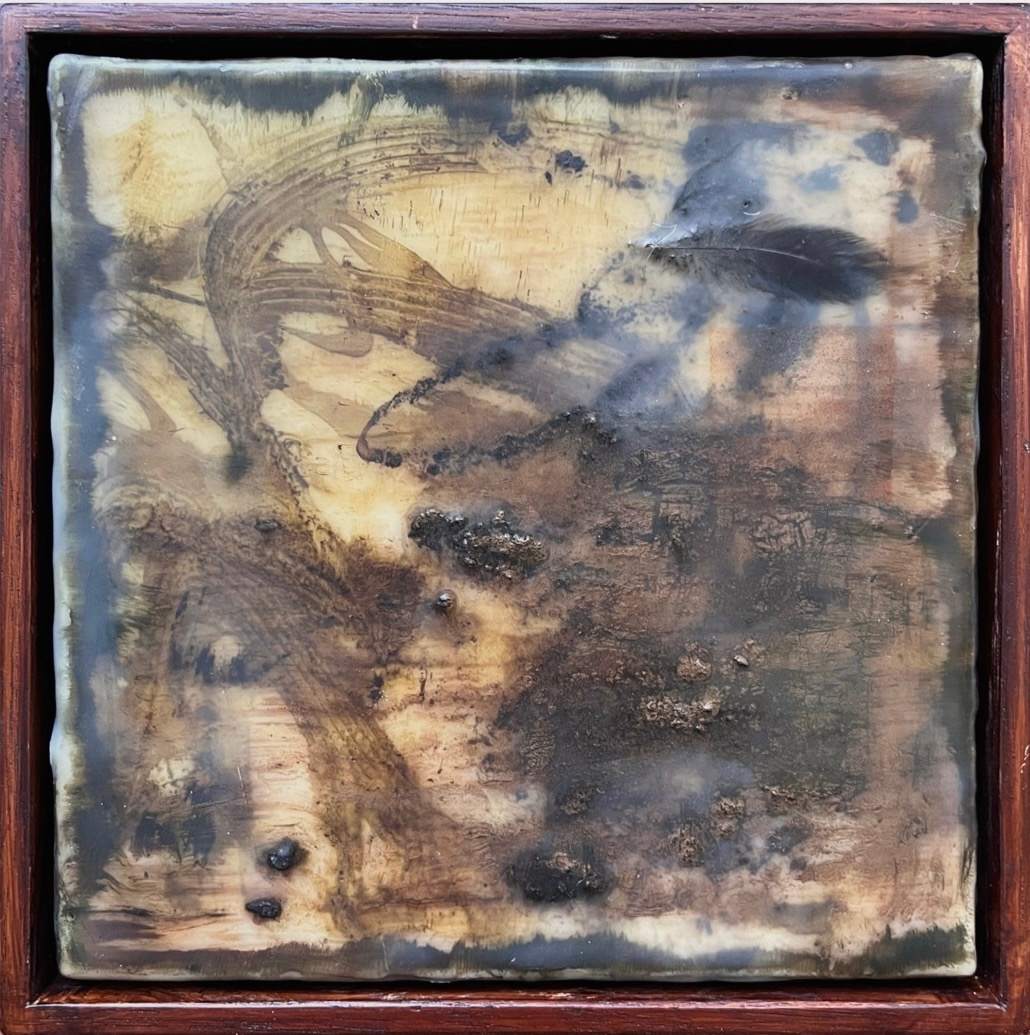 Mixed Media : Solid Encaustic Wax, Ink, Ash, Pigment, Tūī Feather on Wood, Oak Frame
