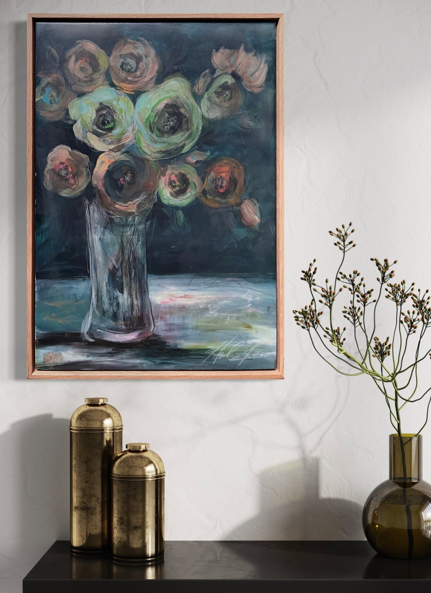 Mixed Media : Encaustic Wax & Acrylic on Wood, Oak Frame