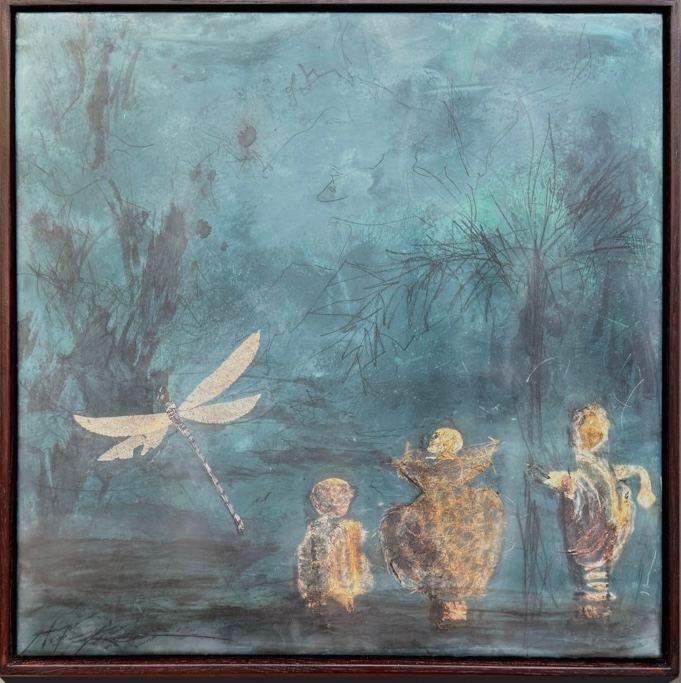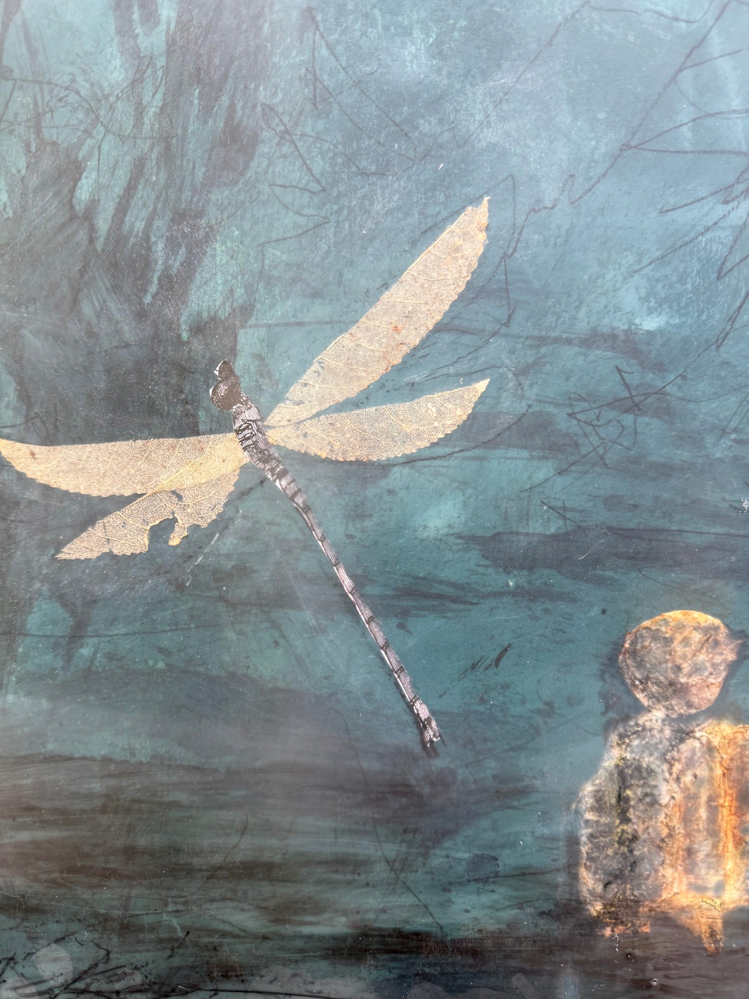Mixed Media : Encaustic Wax, Ink, Collage, Harakeke, Leaf Skeleton, Acrylic on Wood, Solid Oak Frame