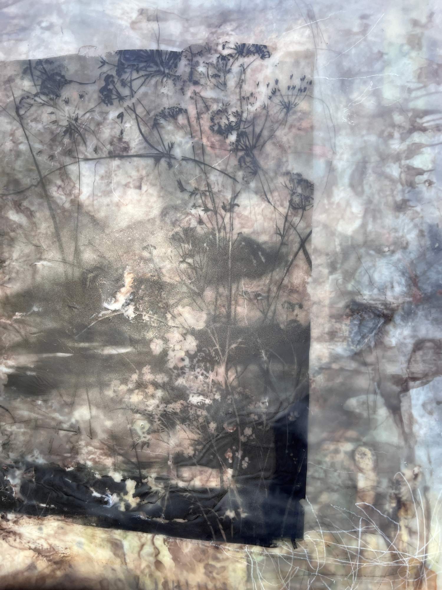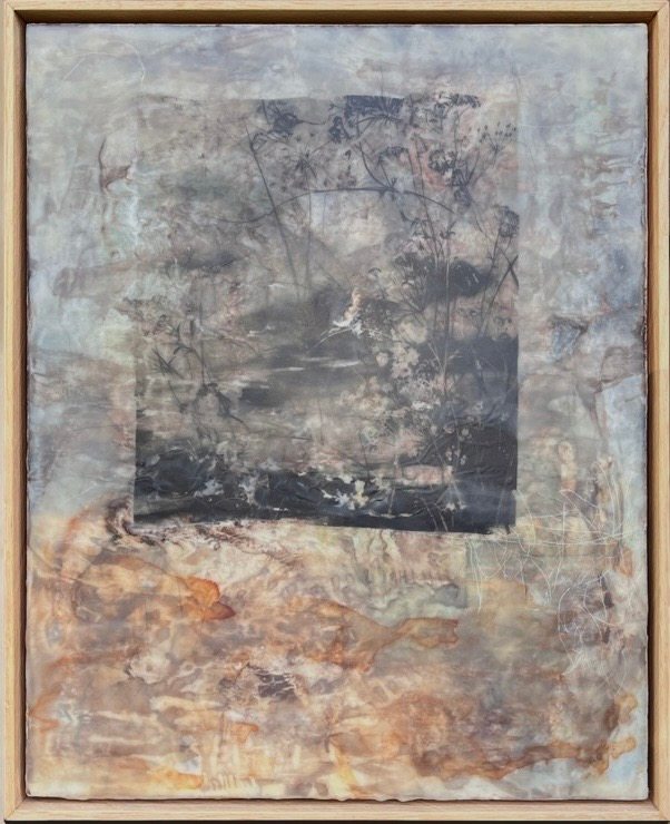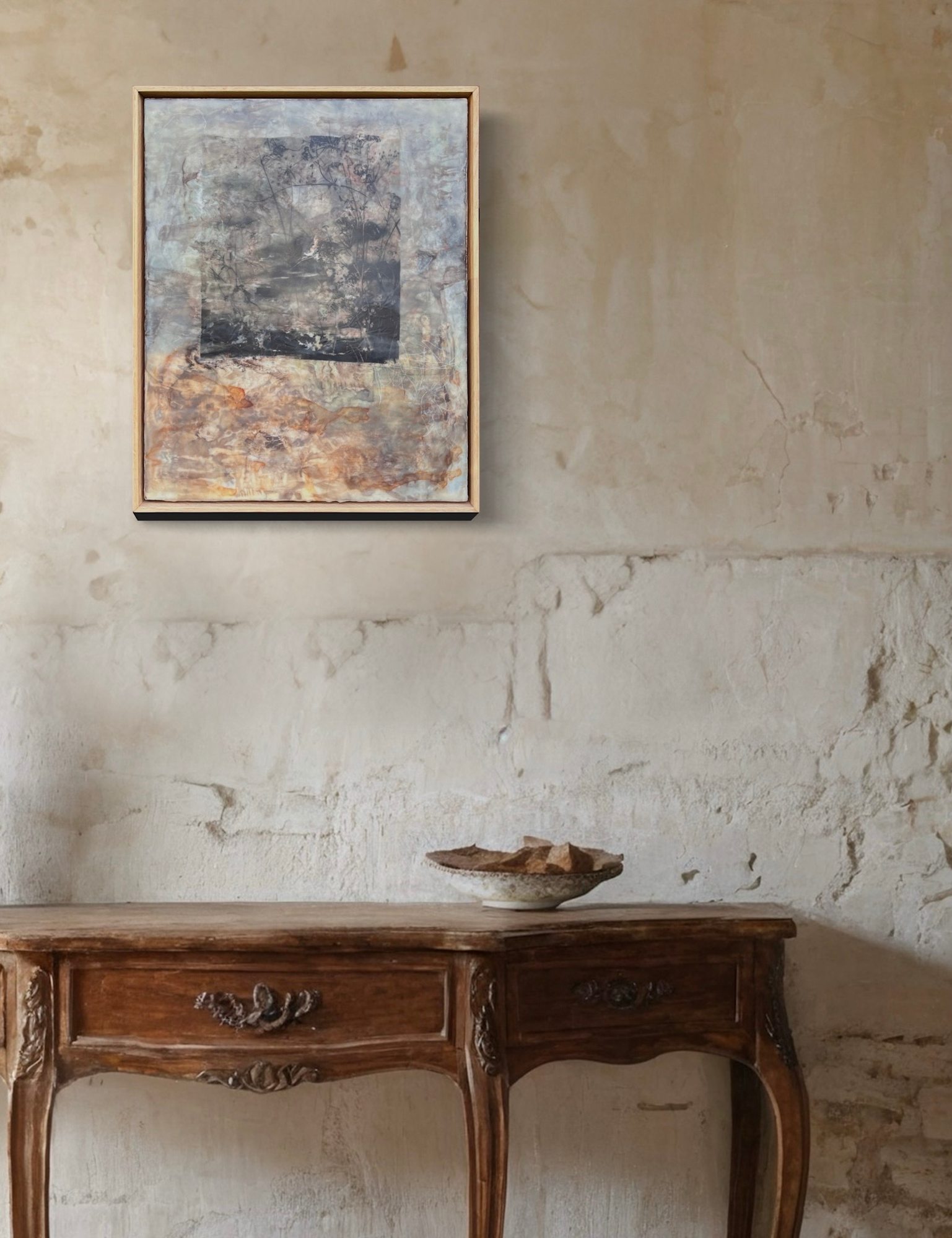 Mixed Media : Encaustic Wax, Acrylic, Ink, Transfer, Paper, Collage on Wood, Solid Oak Frame