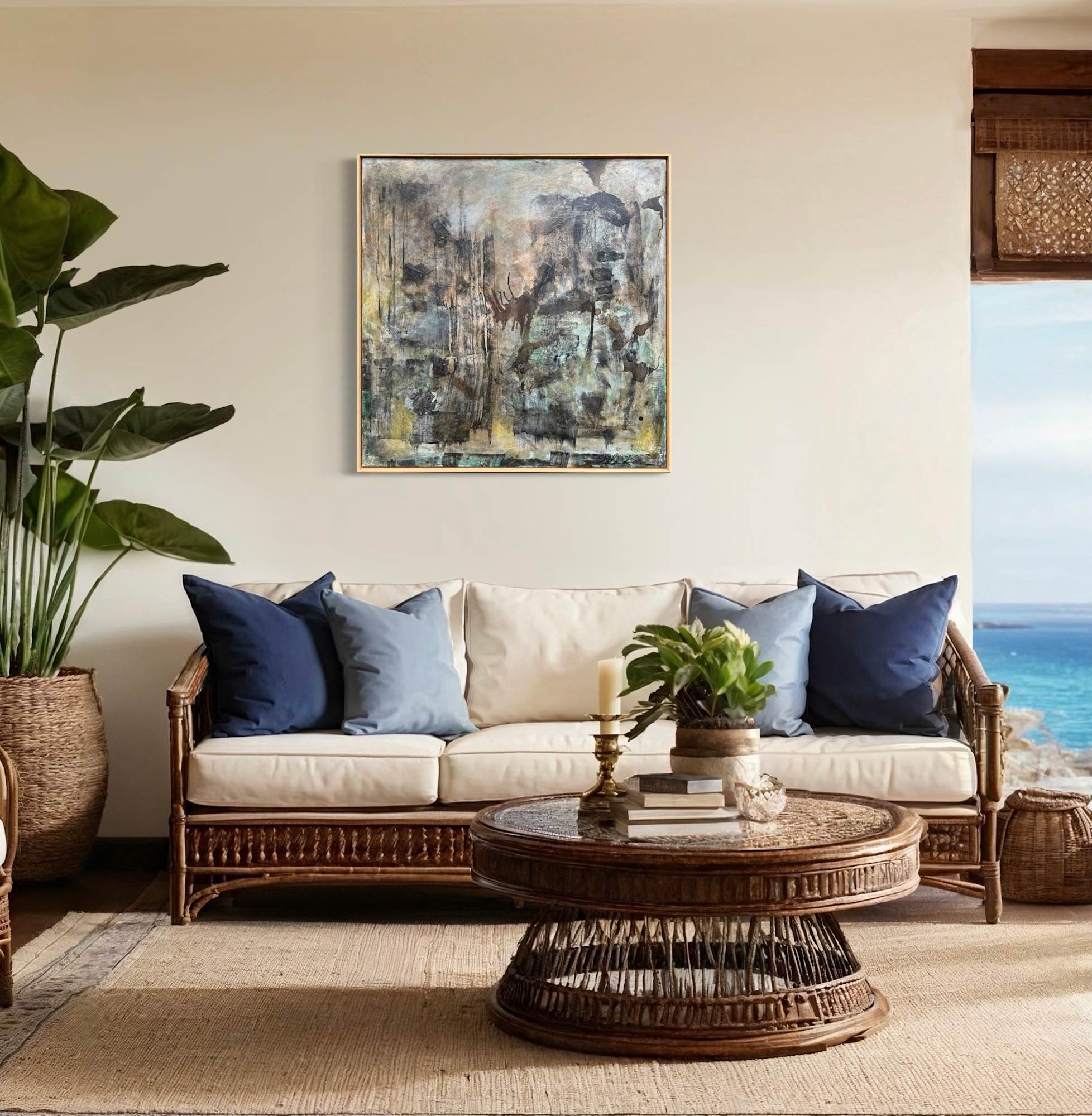 Mixed Media : Encaustic Wax, Acrylic, Ink, Harakeke, Oil on Wood, Solid Oak Frame