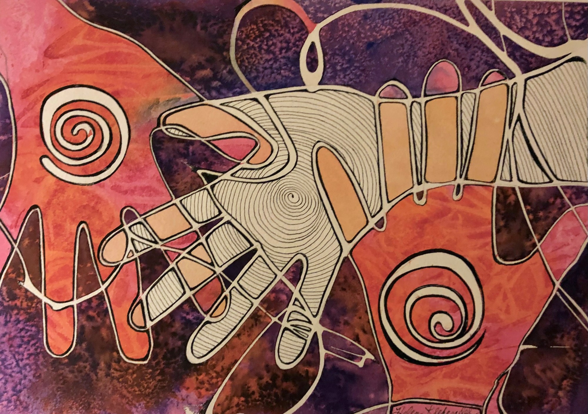 I have been drawing almost every day as a visual meditation. I draw into the teaching texture sampler or simple paintings that I create when I am teaching my watercolor workshops. When I sit down to start drawing, I look at the (often) abstract watercolor samplers and 'find' an image to draw out or enhance. In this case the simple painting was designed with several tracing around my hands and I drew into the painting with ink to enhance it.