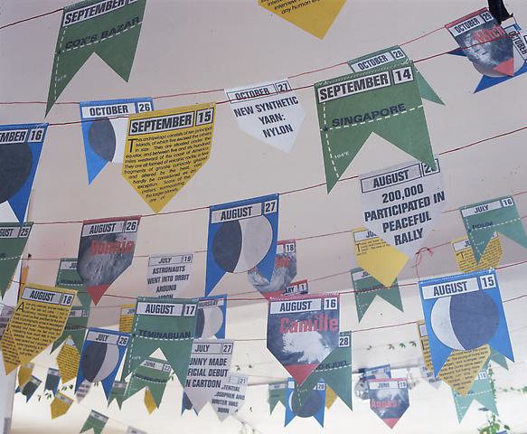 Many bodegas, Asian grocery stores, Indian markets, and curry stands all around New York City proudly decorate their shops with flags and pennant streamer. These flags were once used to decorate public spaces to commemorate special dates. Once, the color syntax encouraged civic or religious observances; now the flags are used for commercial speech. Rather than reminding us of a saint or independence, they now may declare a sale or grand opening. What were once emblems that came out occasionally, are now ever present fixtures. In these stores every day is special. In 2001 Paul Ramirez Jonas utilizes this idea to create the work, Every Day. He designs a calendar, with one flag designated to each day. Together, the flags compile a history where the remembered co-exist with the forgotten, and the mundane is juxtaposed with the significant.
