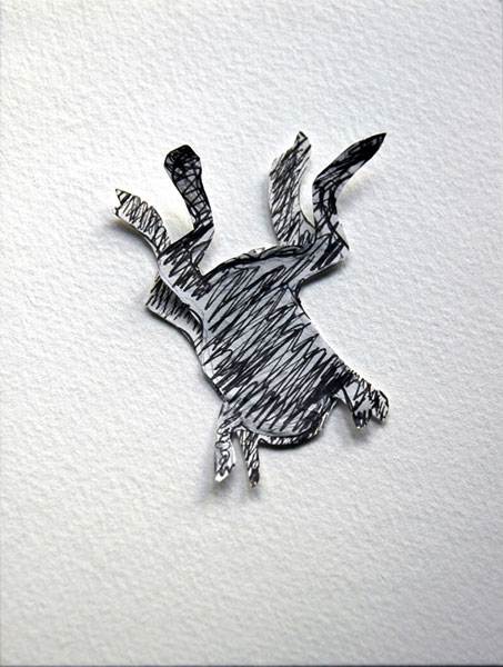 Two cut-outs glued on top of each other onto card stock, their extremities intended to lift free from the surfaces below.