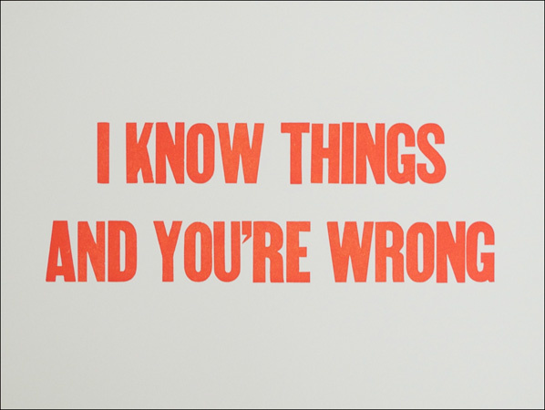 I KNOW THINGS AND YOU’RE WRONG is a sentiment which can come from either the winner or the loser of any debate, and something most of us would love to say on many occasions, if we could get away with it. Rendered permanent on heavyweight paper stock, it becomes a physical reminder of the vacuousness of the internet. The Gothic wood block type originally came from the Baltimore Police Department, and the edition was created at The Arm in Brooklyn, November 2014.