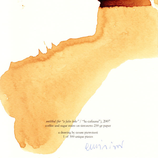 text on card: "Untitled (for a "a false luke" / "lu cafausu"), 2007. coffee and sugar stains on tintoretto 250 gr paper. a drawing by Cesare Pietroiusti. 1 of 500 unique pieces."