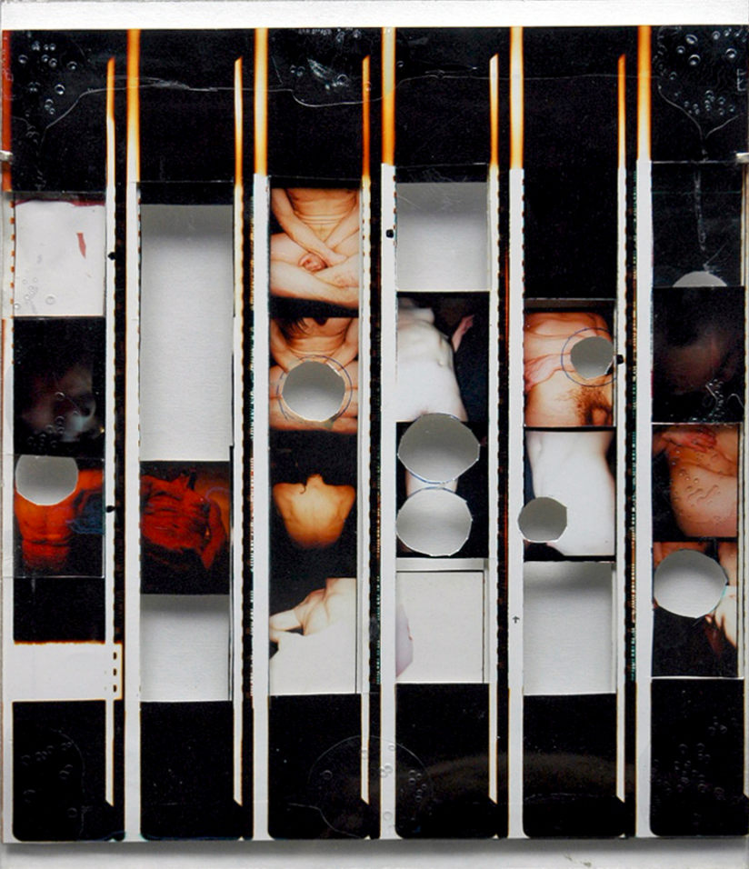 Two contact sheets with cutouts layered between two plexi-sheets.