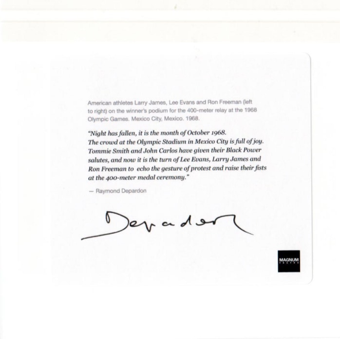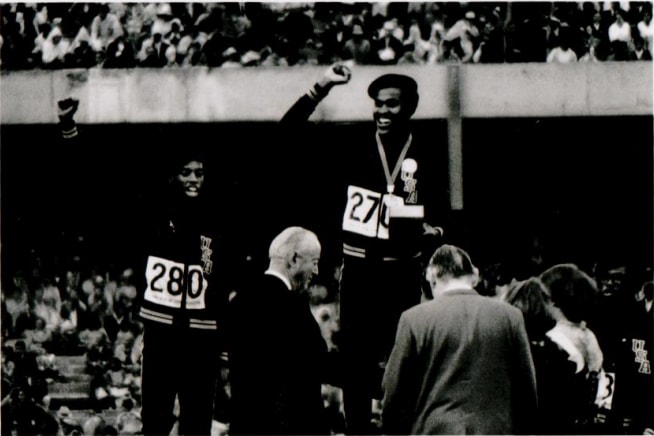 The Artist writes: " Night has fallen, it is the month of October 1968. The crowd at the Olympic Stadium in Mexico City is full of joy. Tommie Smith and John Carlos have given their Black Power salutes, and now it is the turn of Lee Evans, Larry James, and Ron Freeman to echo the gesture of protest and raise their fists at the 400-meter medal ceremony".