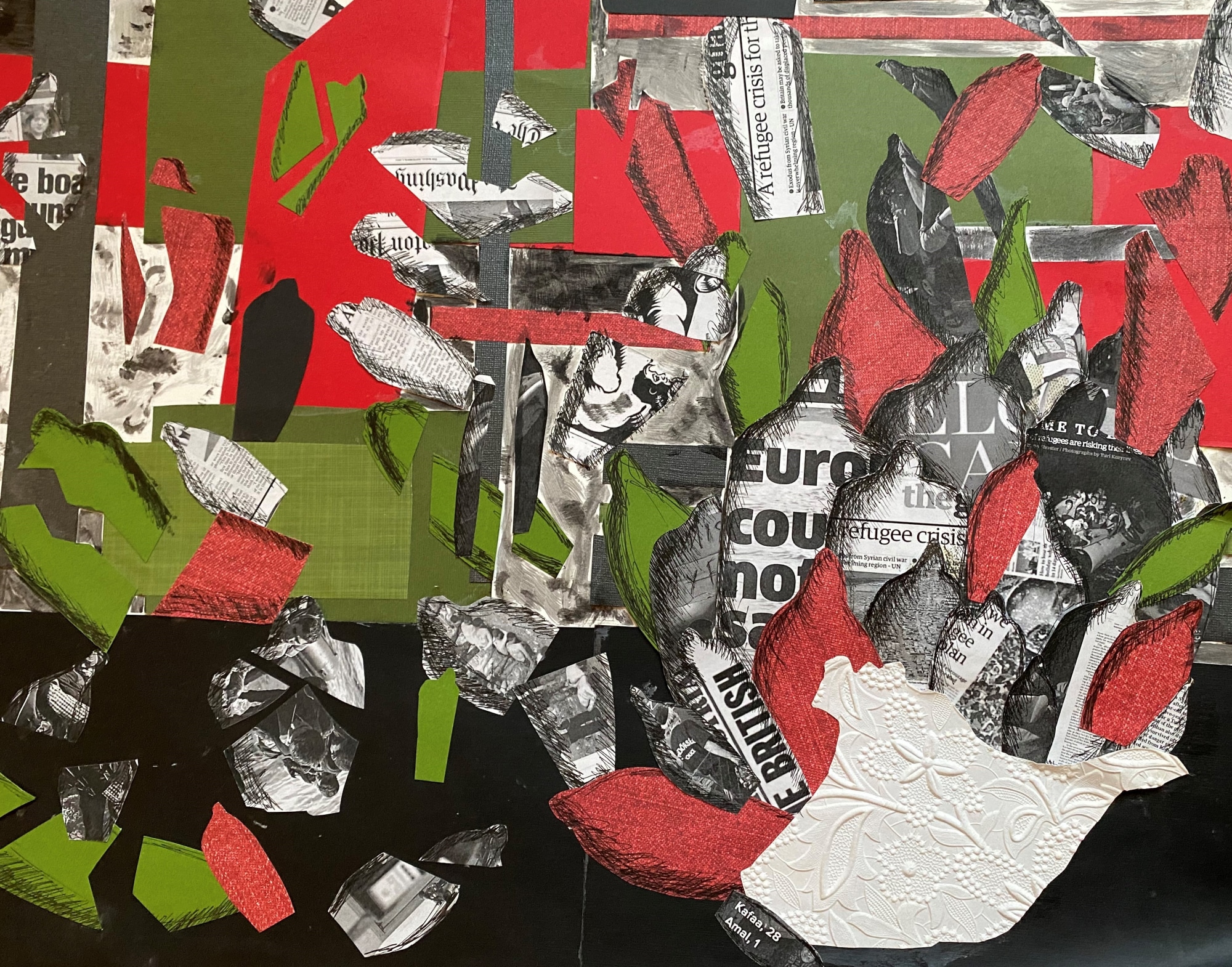 The work was inspired by the news coverage of the refugee crisis in Europe in 2016, when so many were trying to get in and there was so much backlash. The artist saw news reports and made printouts from the news including headshots, names of people, and the age of a child who passed away. The artist says that it was, “Grueling to be an outsider looking in. I wish I could have helped.”