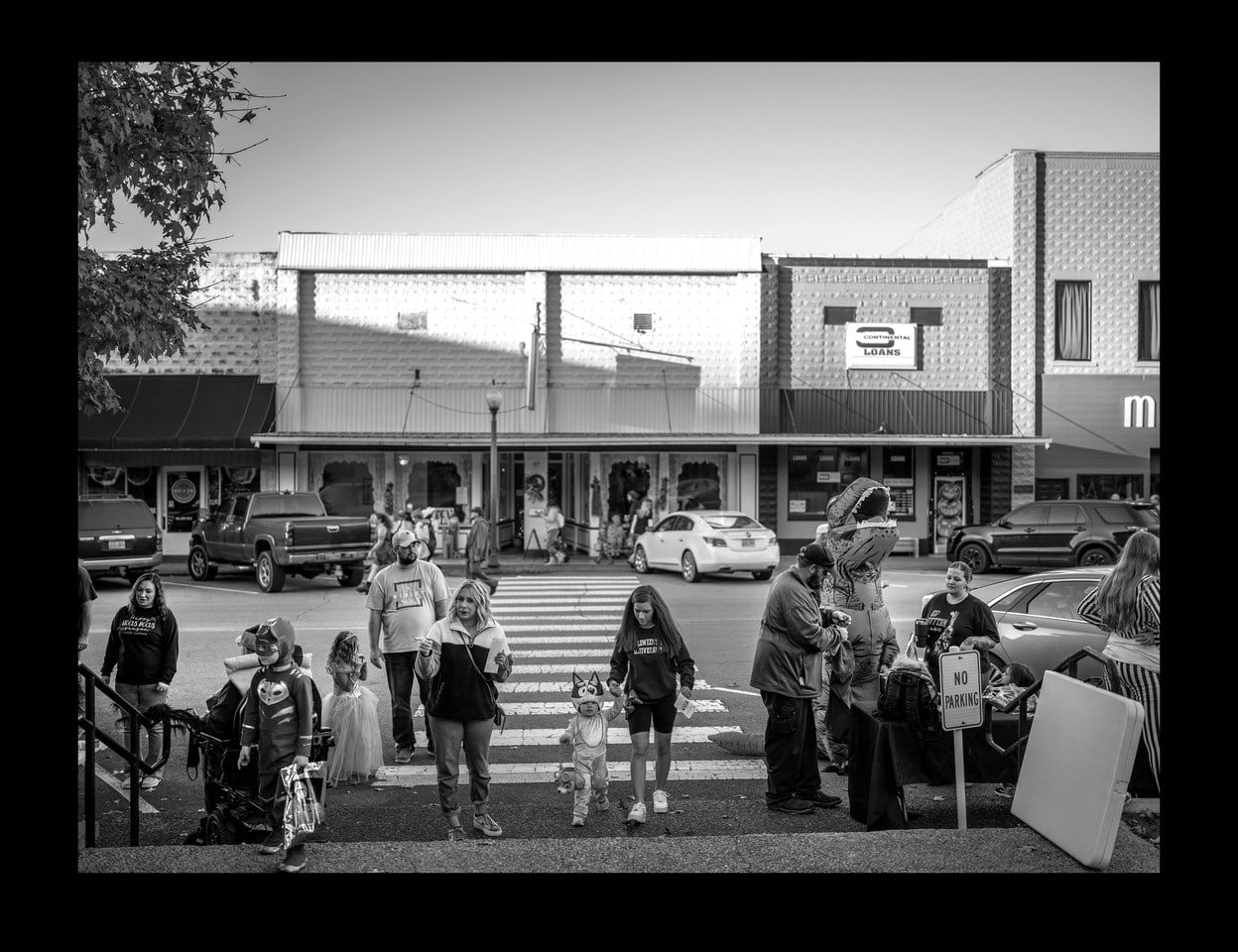 Thank you to Roy Groething for the generous donation of this print. The artist writes, "This was part of a broader series I did for NPR on Waverly, TN after they had a massive flood that killed several in their community and destroyed many homes. This was part of a multiple part series on climate change. We followed people making the hard choice whether to rebuild or move on and others grappling with restoring a community after such a catastrophic event. " The original caption for the photograph was, "Trick or Treating gets underway during the Halloween in Downtown Waverly, Tenn on Oct. 31, 2021."