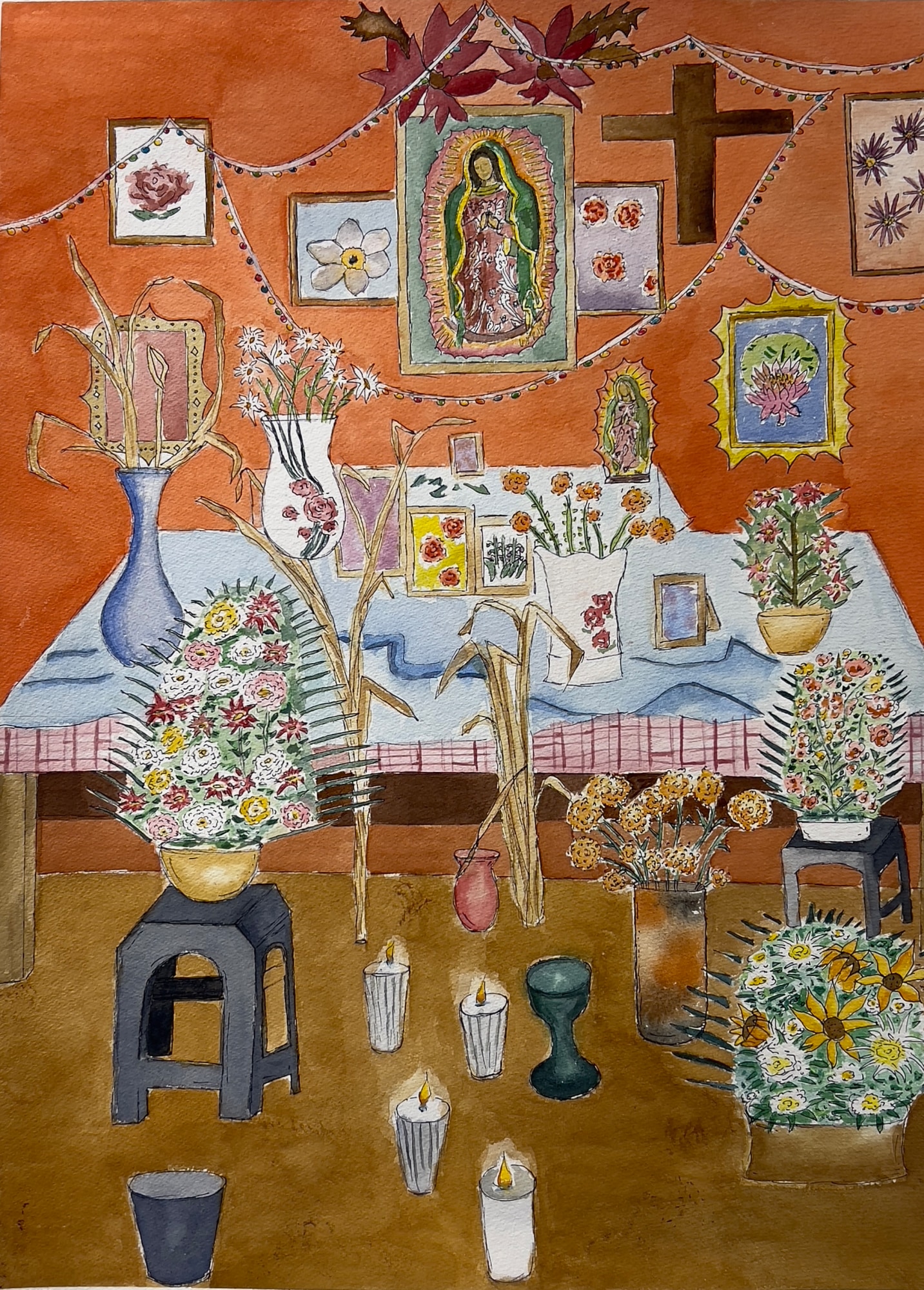 The artist says "My upbringing in a vibrant Mexican household ignited my love for creativity. Initially drawn to fashion and styling, my journey into art was unexpected. Surprisingly, watercolor became a passion I never anticipated, and now becoming the main medium I work with. As stated in the first few sentences, I was raised by Mexican parents, and as a first-generation daughter deeply rooted in Mexican heritage, I proudly embrace my Chicana identity while expressing myself as an artist, forming a sincere connection through my work with the rich tapestry of my culture. My family, community, and Mexican-American artists I look up to serve as my greatest influences. Working with acrylic, watercolor, and charcoal, I find my artistic stride primarily in watercolor and ink, which shine in my most successful pieces. Each creation begins with a brainstorm of the idea and the message I wish to convey, drawing inspiration from my family and cultural background. I aspire to transition into an art school offering fashion design studies while nurturing my passion for art. I aim to merge my fine arts foundation with fashion design and merchandising, believing that this comprehensive knowledge will shape my future as a Mexican-American artist expressing the beauty of my heritage and where my parents grew up in".
