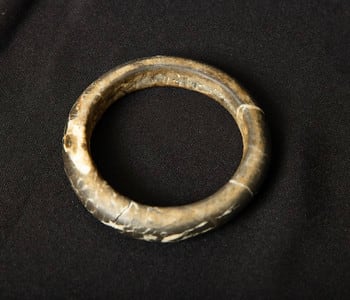 This bracelet comes from Mali, West Africa. These bracelets were also used as ancient currency for trade. It is veined granite or quartz. Thank you to Herman and Wendy Klarsfeld for the generous donation of this work.