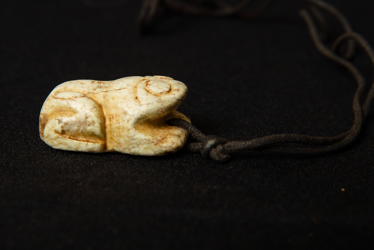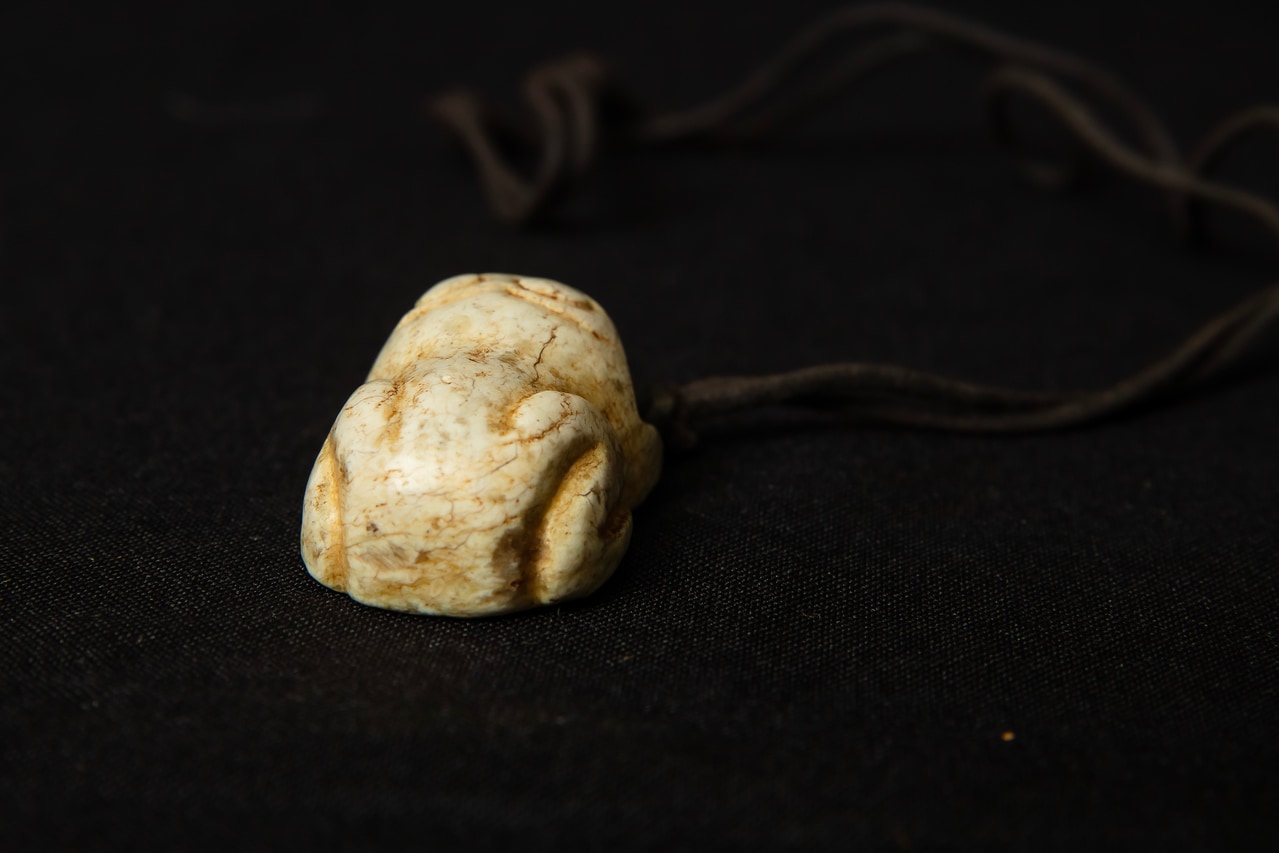 This amulet--a pre-Columbian, white, stone carving of a frog--has a drilled hole for a wearing strap. It was made in Costa Rica. Thank you to Dr. Jonathan Klarsfeld for the generous donation of this work.