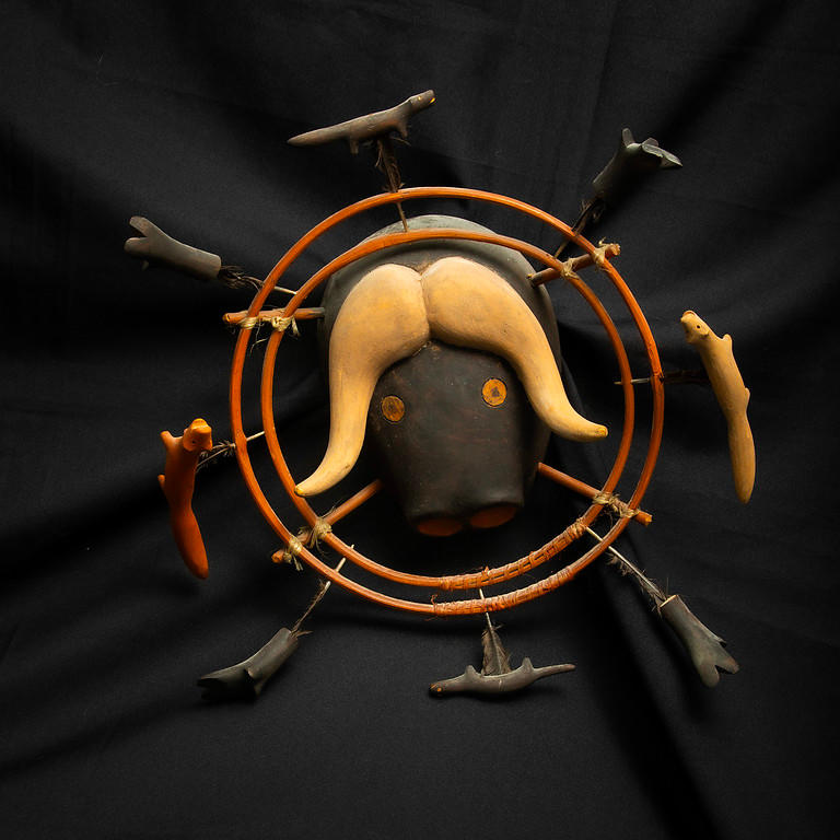 This wood carved mask from the Nunivak Island represents a musk ox. There are rings with 8 various carved animal attachments and remnants of red and black pigments. Thank you Herman and Wendy Klarsfeld for the generous donation of this work.