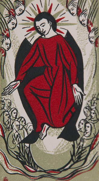 - Untitled (Holy Cards--Red Jesus with 6 Angel Heads above and Many Human Figures below), c. 1970