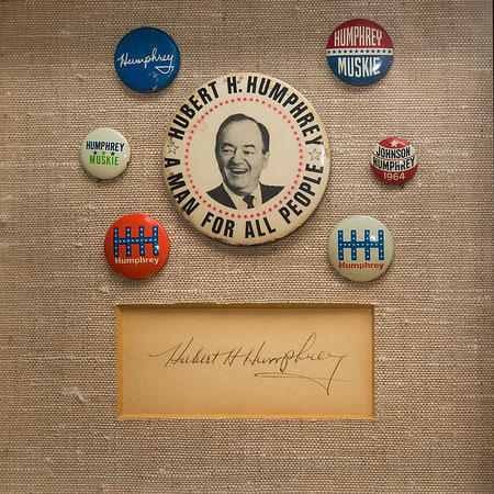 Minnesotan Hubert Humphrey spent much of his life in public service to the United States. In addition to being a Senator, he served as Vice President under Lyndon B. Johnson from 1965-9. He was the Democratic Presidential candidate during the 1968 election, and was defeated by Republican candidate Richard Nixon. His Vice-Presidential running mate was Edmund Muskie. At the bottom of this work is Humphrey’s autograph. The political buttons come from many different campaigns for public office.