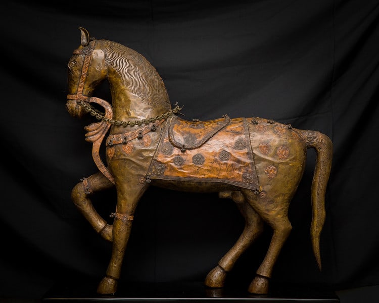 This is a metal-clad, hand-carved wood horse in the Indian Mughal style, from Rajasthan.