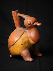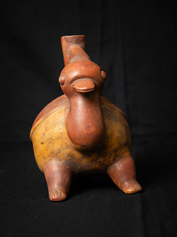 This pre-Columbian spouted pottery vessel in the form of a stylized duck comes from the Colima Alcarraza culture in Mexico. Thank you to Dr. Jonathan Klarsfeld for the generous donation of this work.