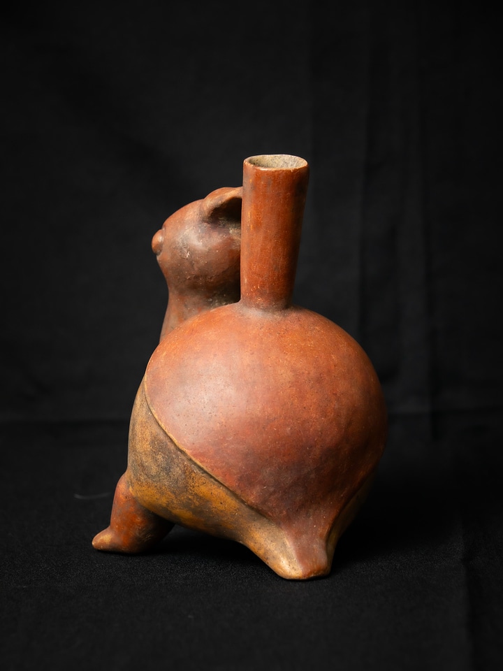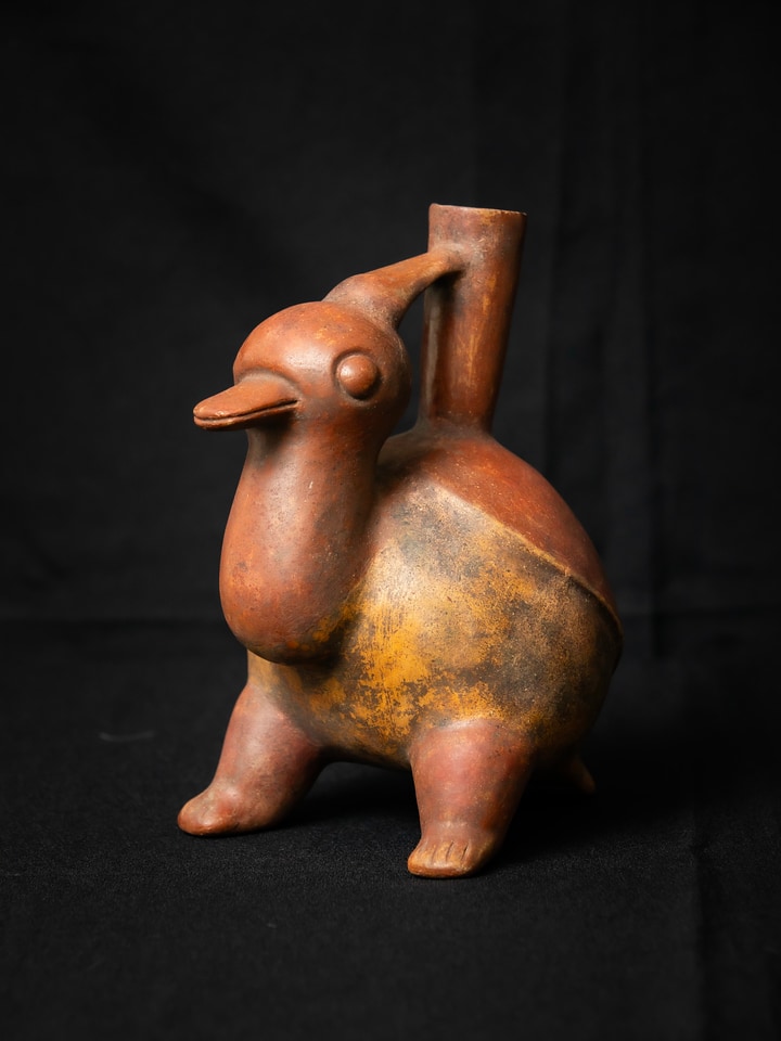 This pre-Columbian spouted pottery vessel in the form of a stylized duck comes from the Colima Alcarraza culture in Mexico. Thank you to Dr. Jonathan Klarsfeld for the generous donation of this work.