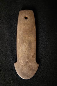 This red slate carved anchor pendant has a drilled hole on top. It is a prehistoric artifact by the Indigenous People of the Woodland Period. Thank you to Herman and Wendy Klarsfeld for the generous donation of this work.