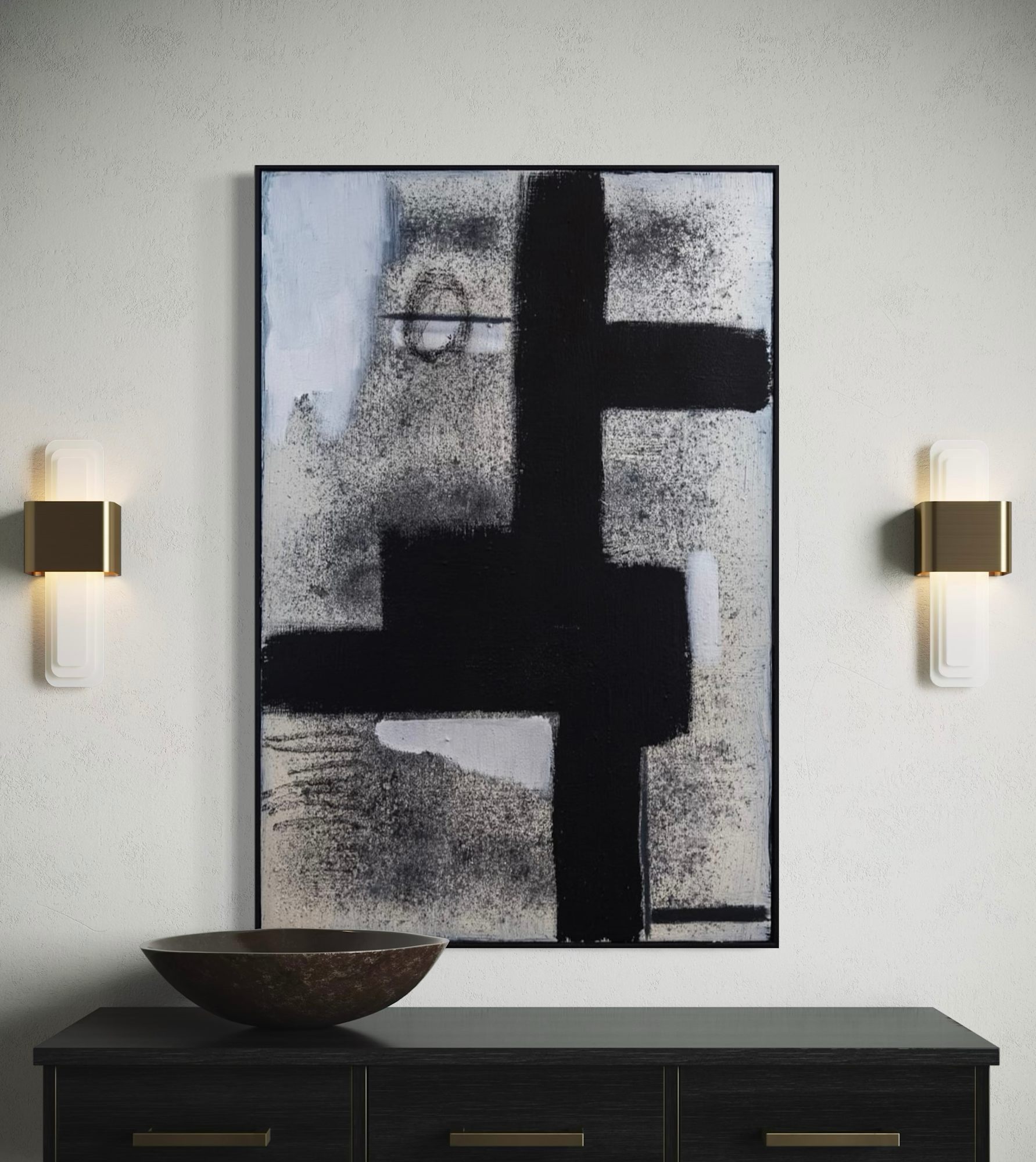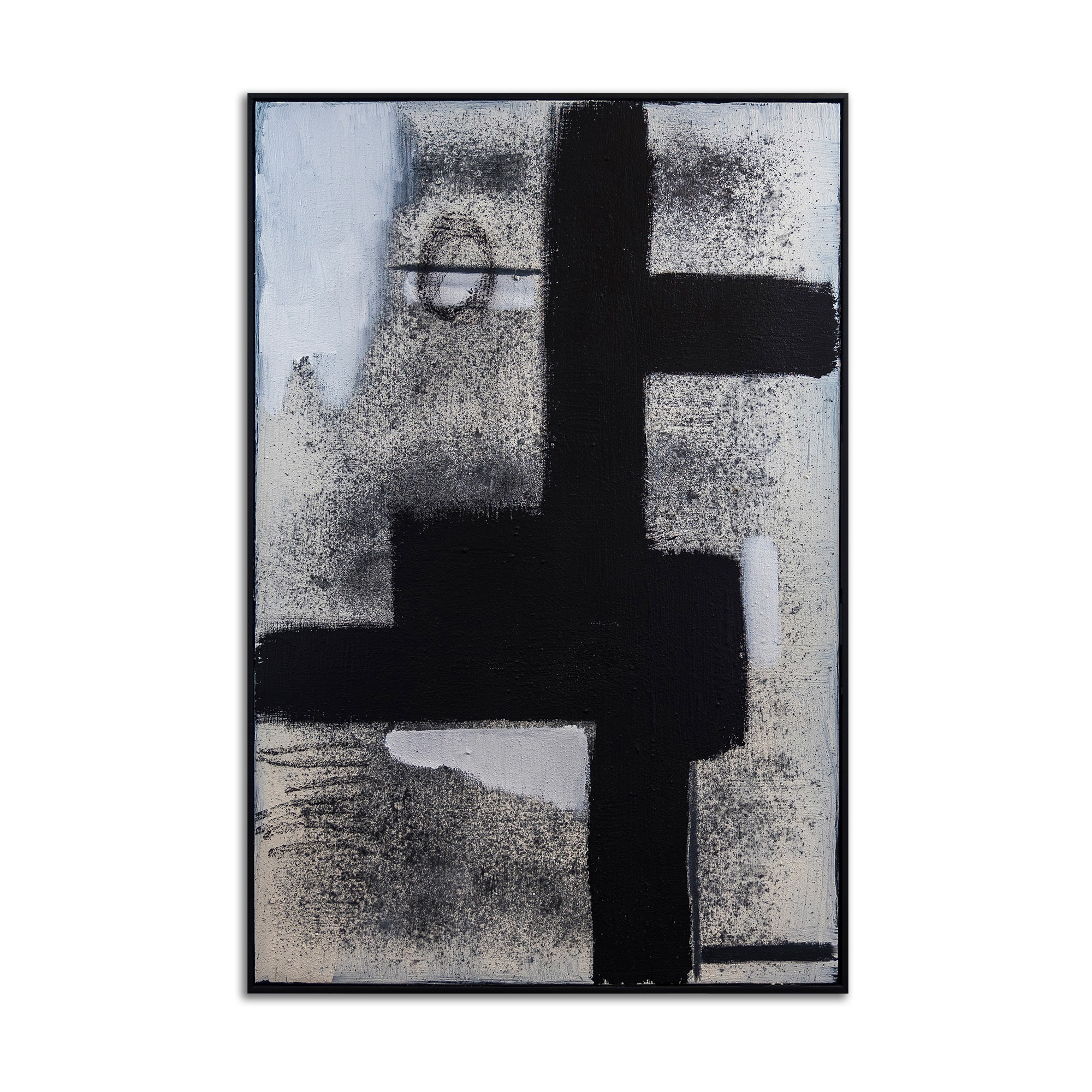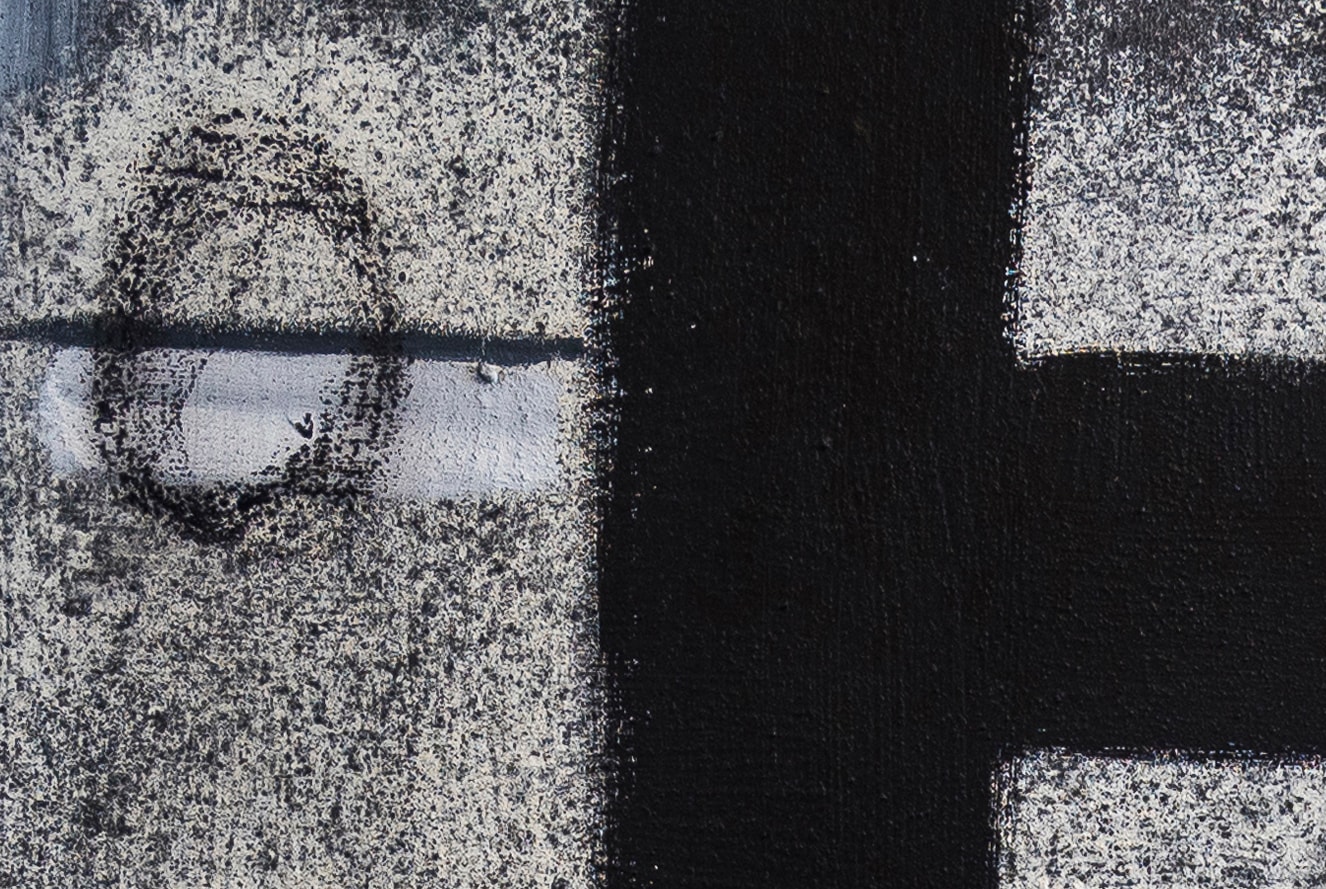 Original abstract painting by J. Kent Martin in black, white, and gray with intersecting geometric forms. Contradiction explores opposing forces—bold vertical and horizontal strokes collide with soft, diffused textures, creating a dynamic visual tension. The composition feels both structured and unsettled, drawing the viewer into its layered dualities.