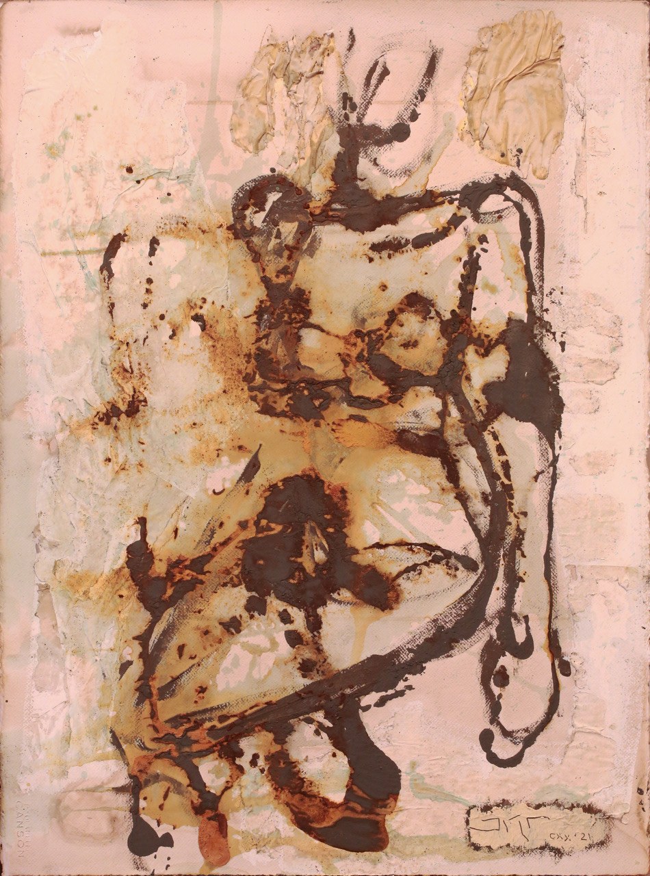 - Paper, latex paint, acrylic paint, coffee, wood glue, iron, and rust