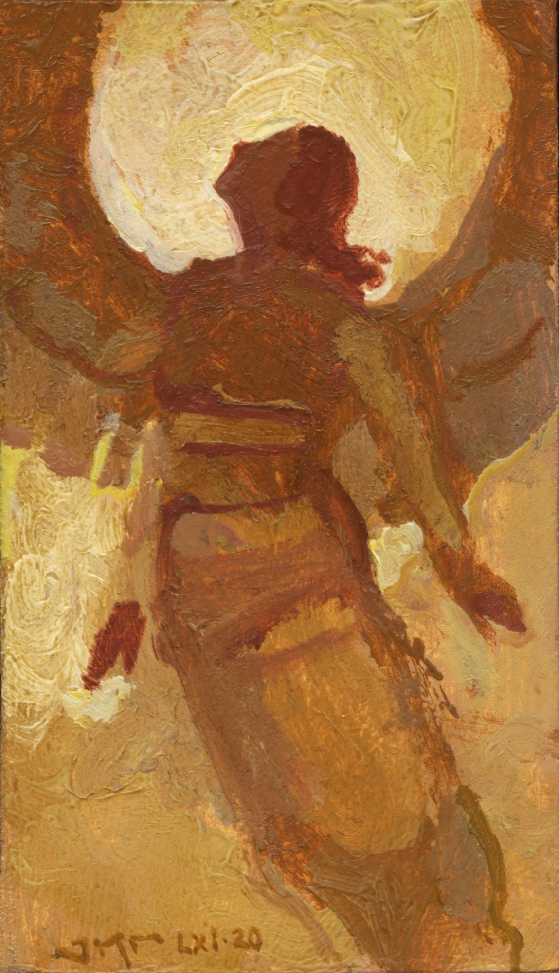Towards the Light  Image: Business Card Show JKR Gallery 2021. An angel moves upwards towards the sun.
