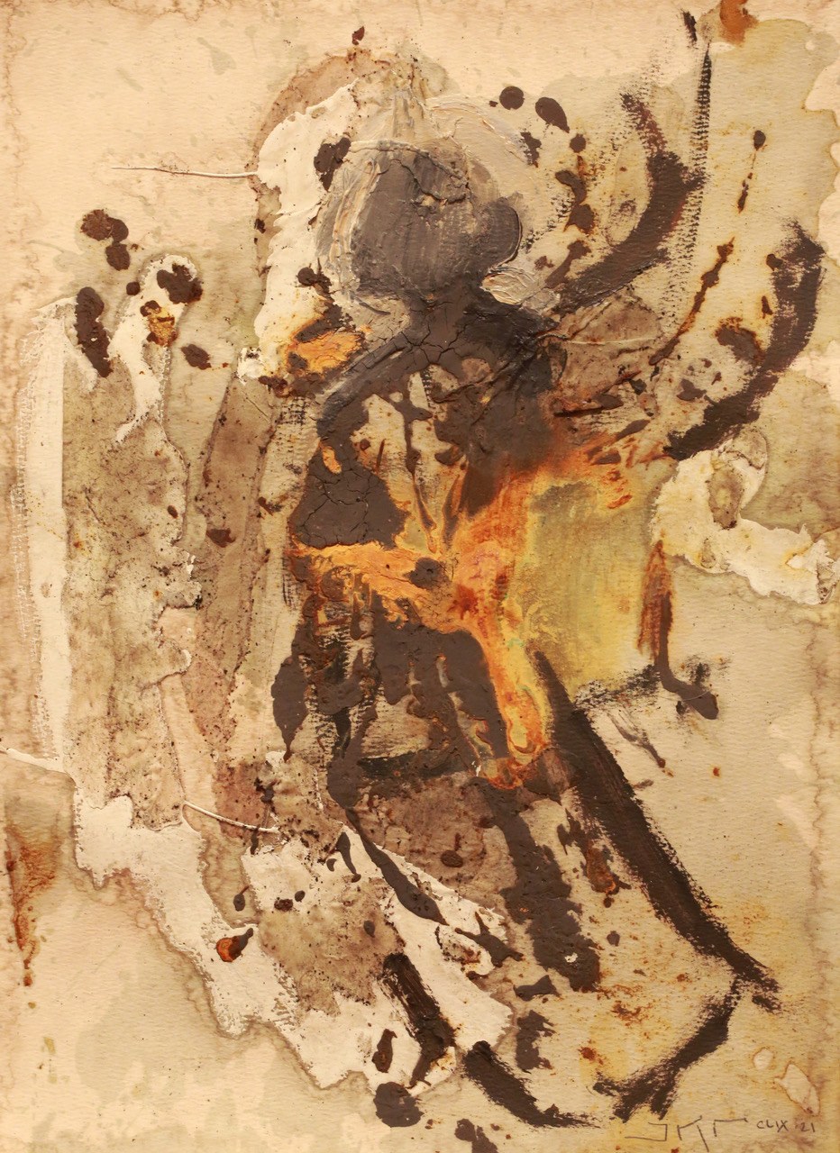 - Paper, latex paint, acrylic paint, coffee, wood glue, iron, and rust