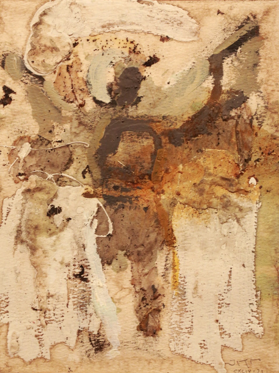 - Paper, latex paint, acrylic paint, coffee, wood glue, iron, and rust