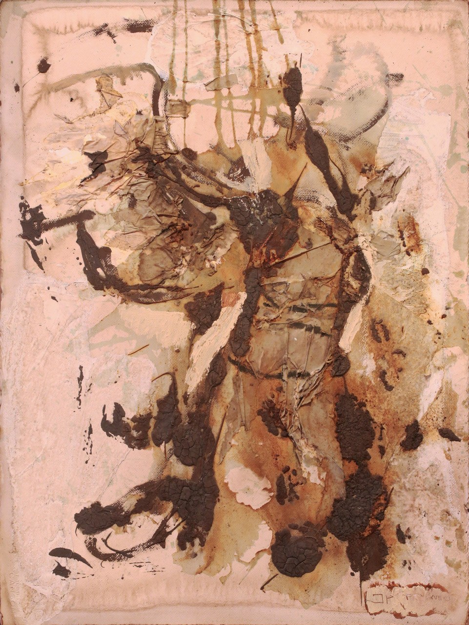 - Paper, latex paint, acrylic paint, coffee, wood glue, iron, and rust