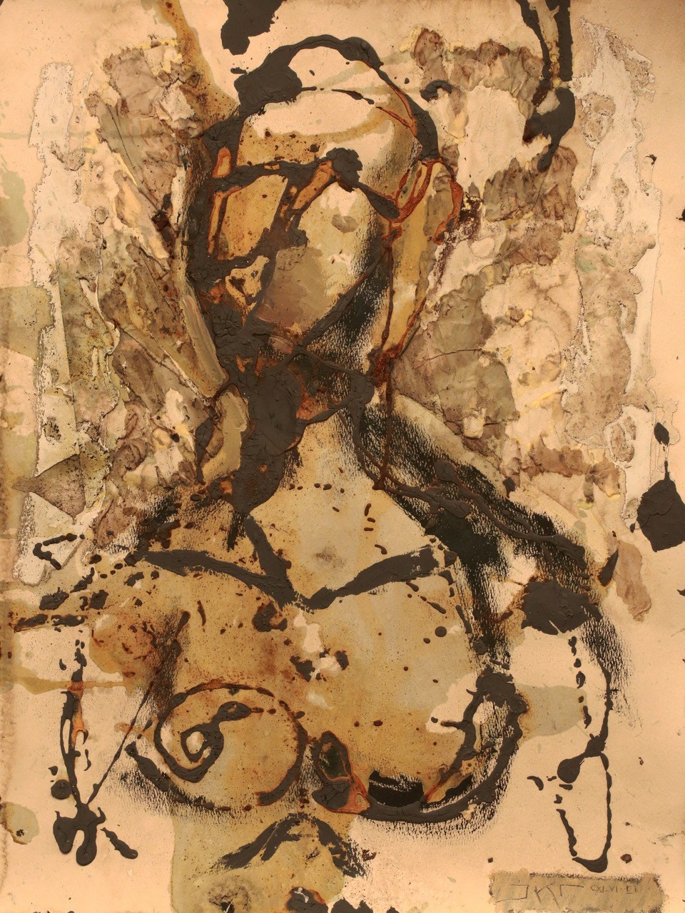 - Paper, latex paint, acrylic paint, coffee, wood glue, iron, and rust