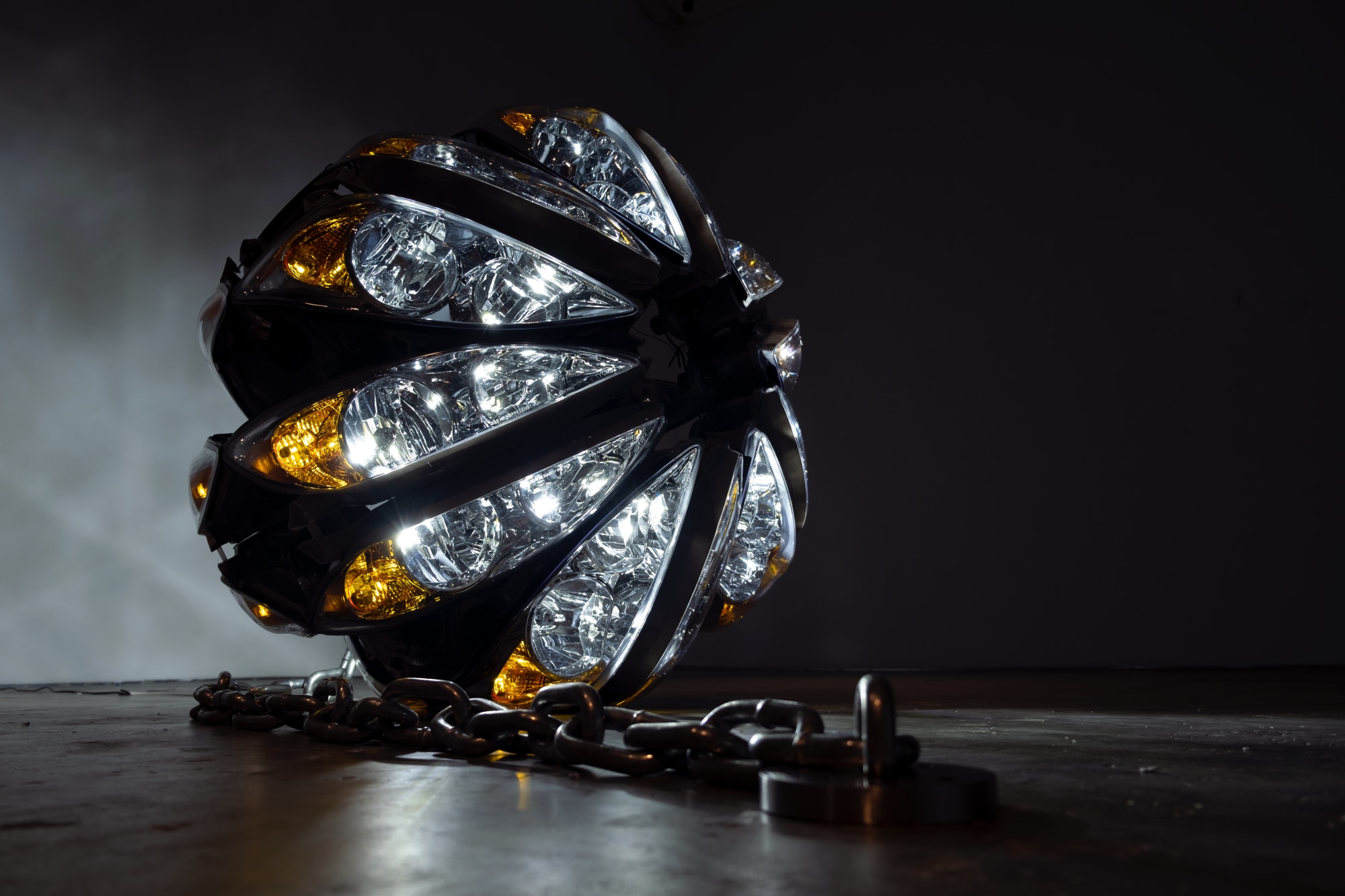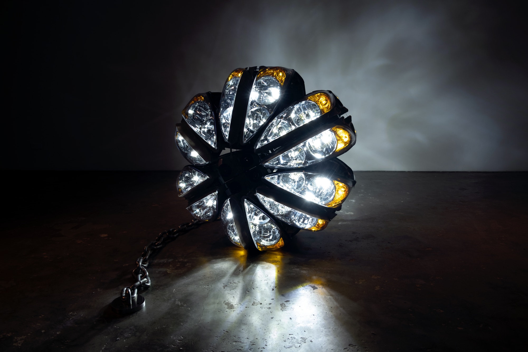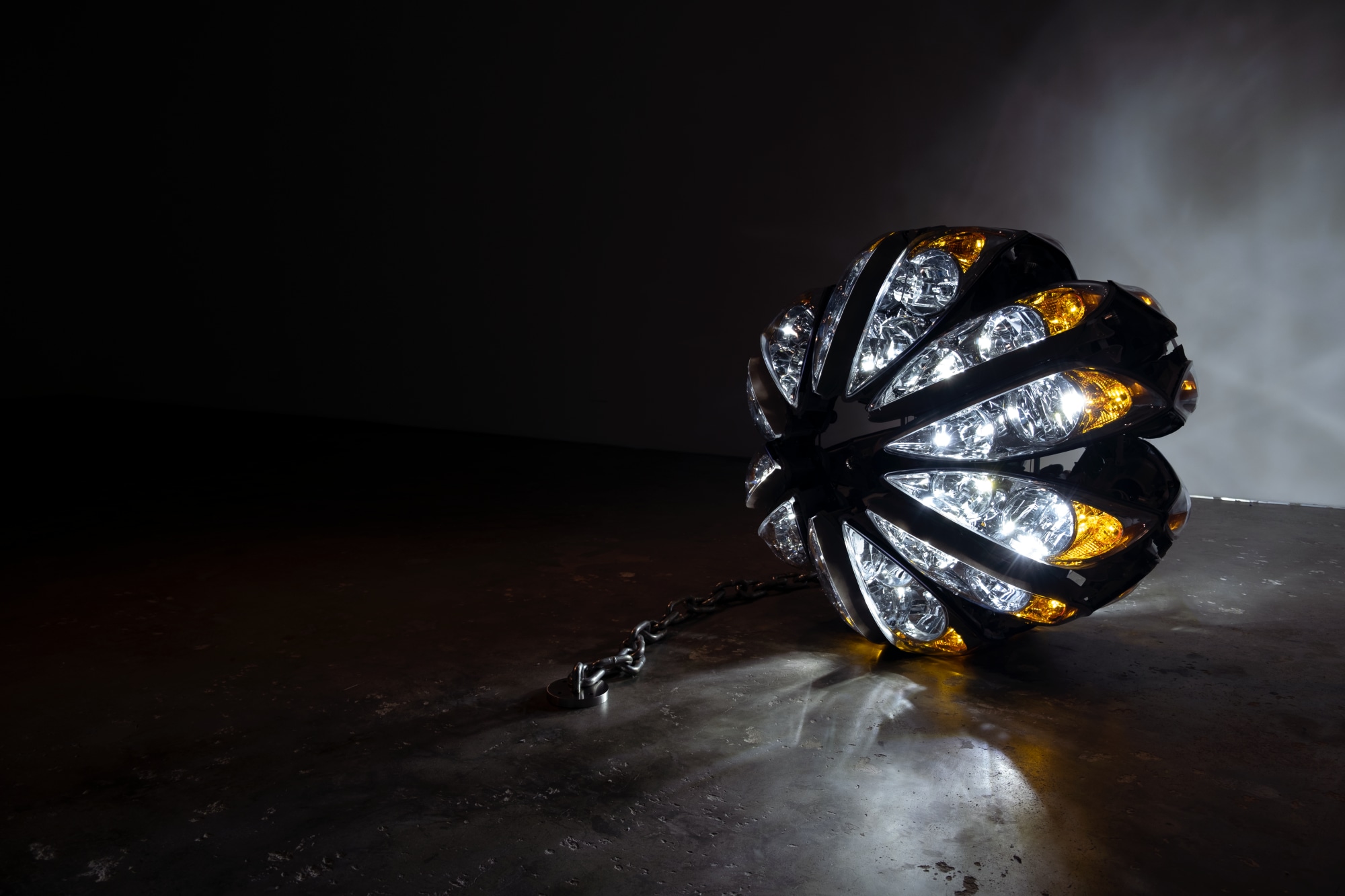 24 car headlights are configured into a sphere. LED lighting is integrated into the headlights and the power cable interwoven with a thick chain that connects it to the power outlet.
