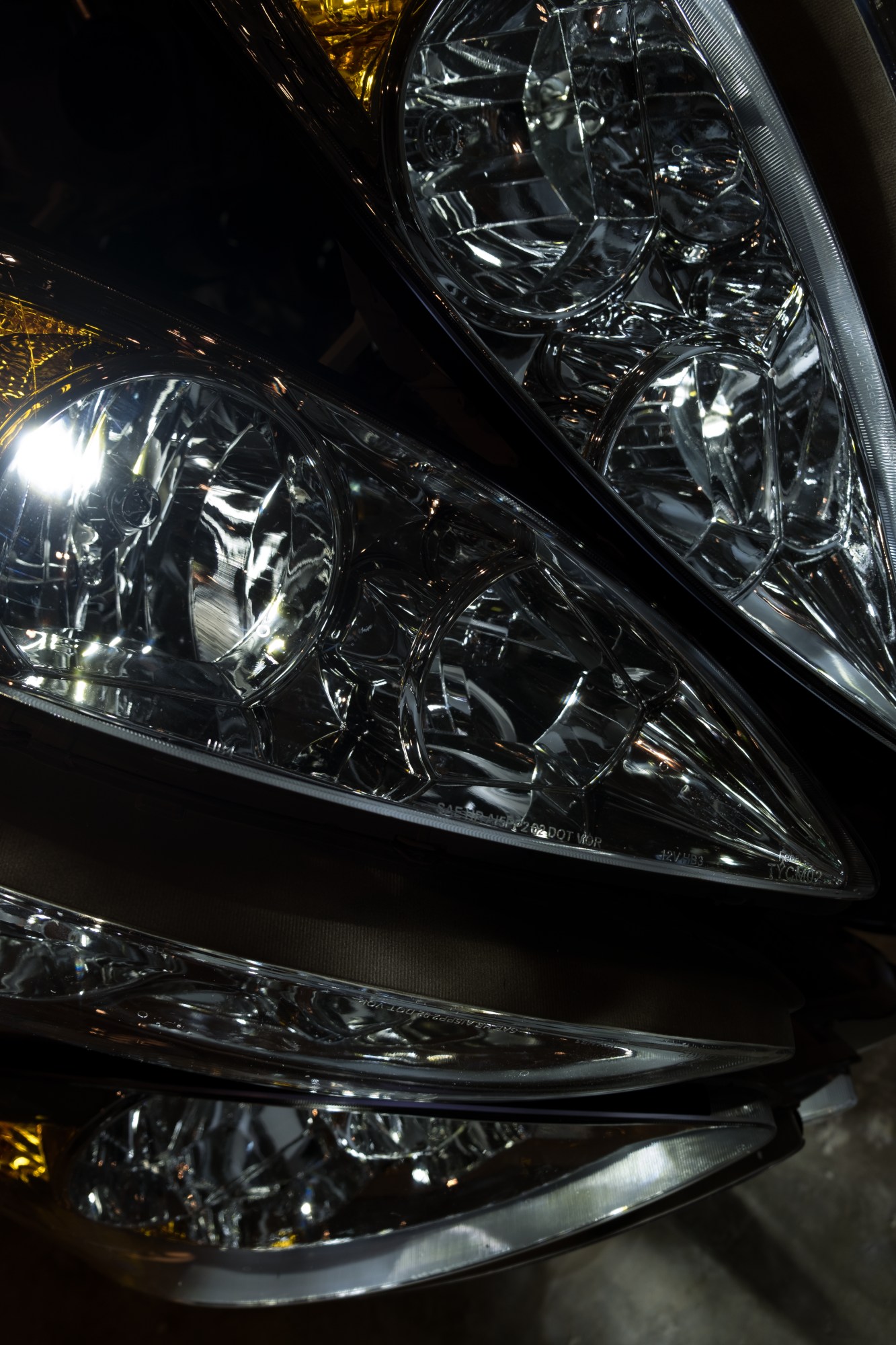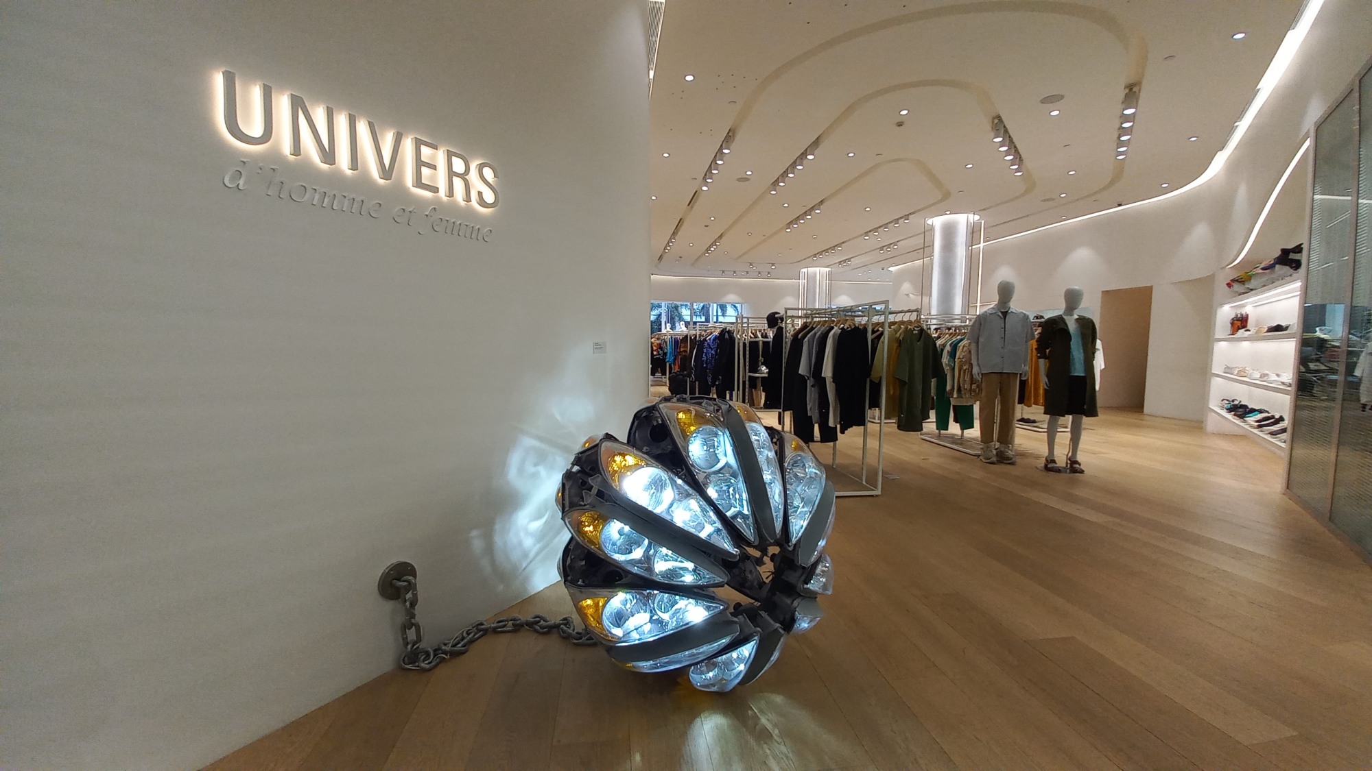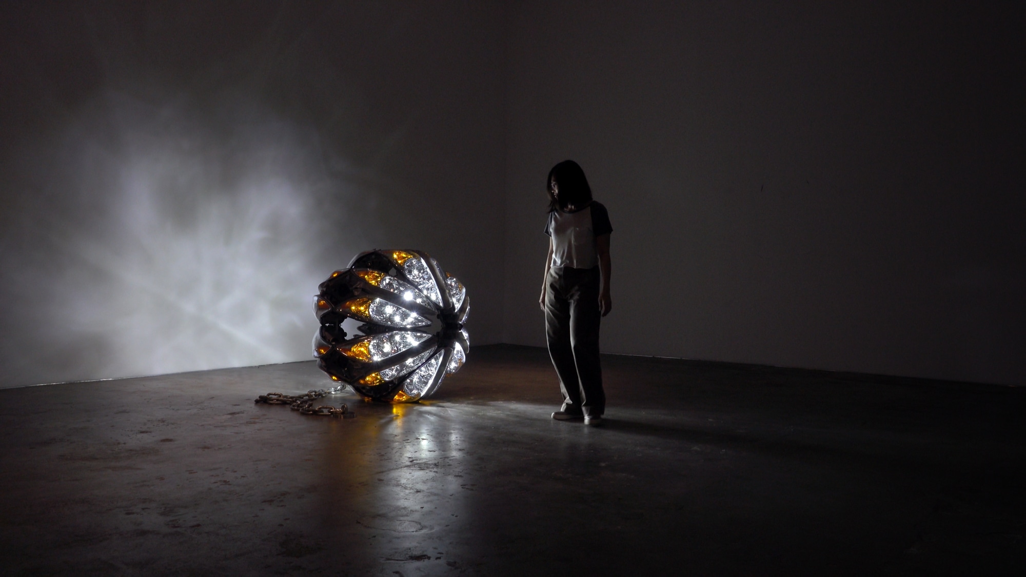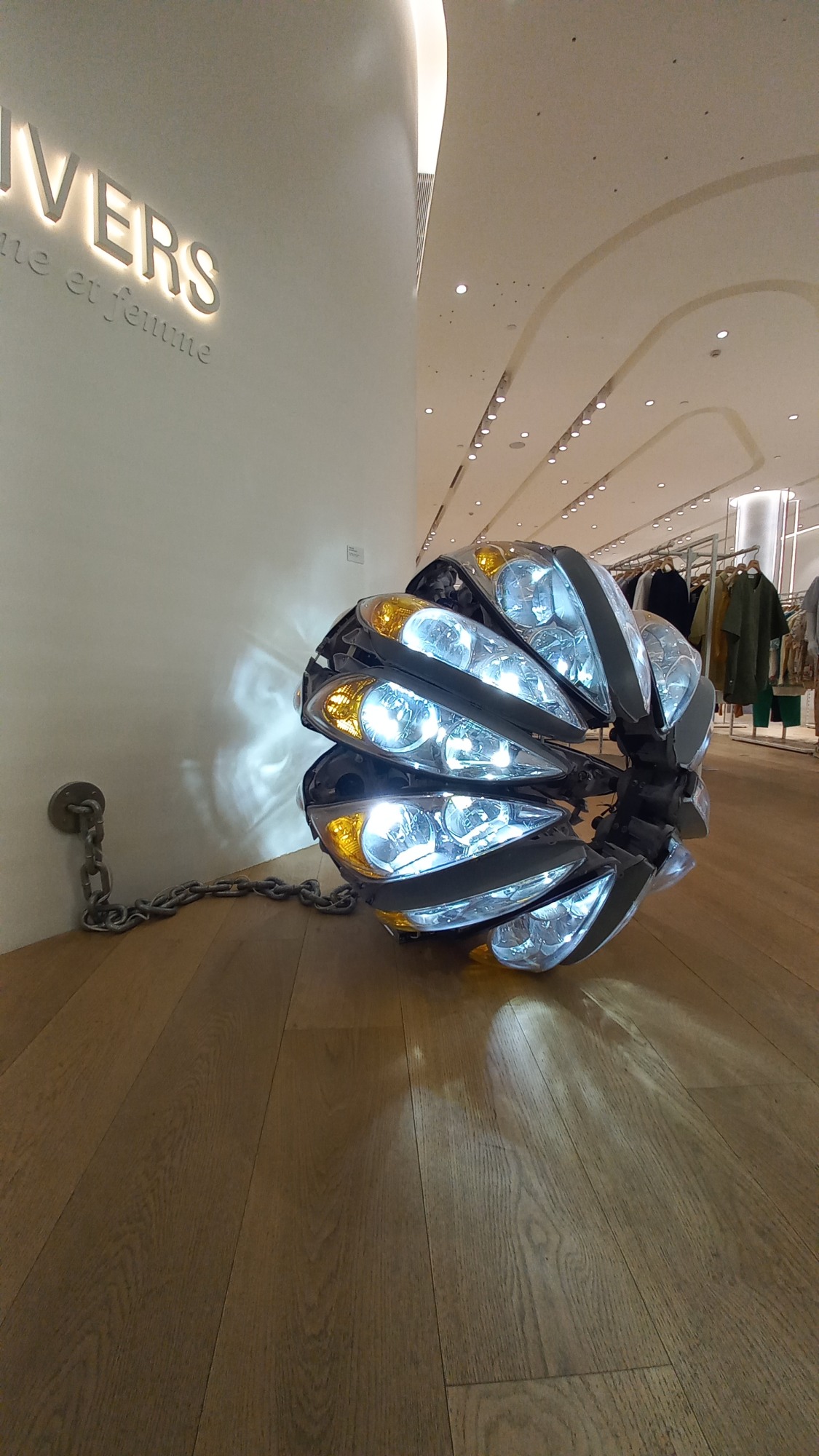 24 car headlights are configured into a sphere. LED lighting is integrated into the headlights and the power cable interwoven with a thick chain that connects it to the power outlet.