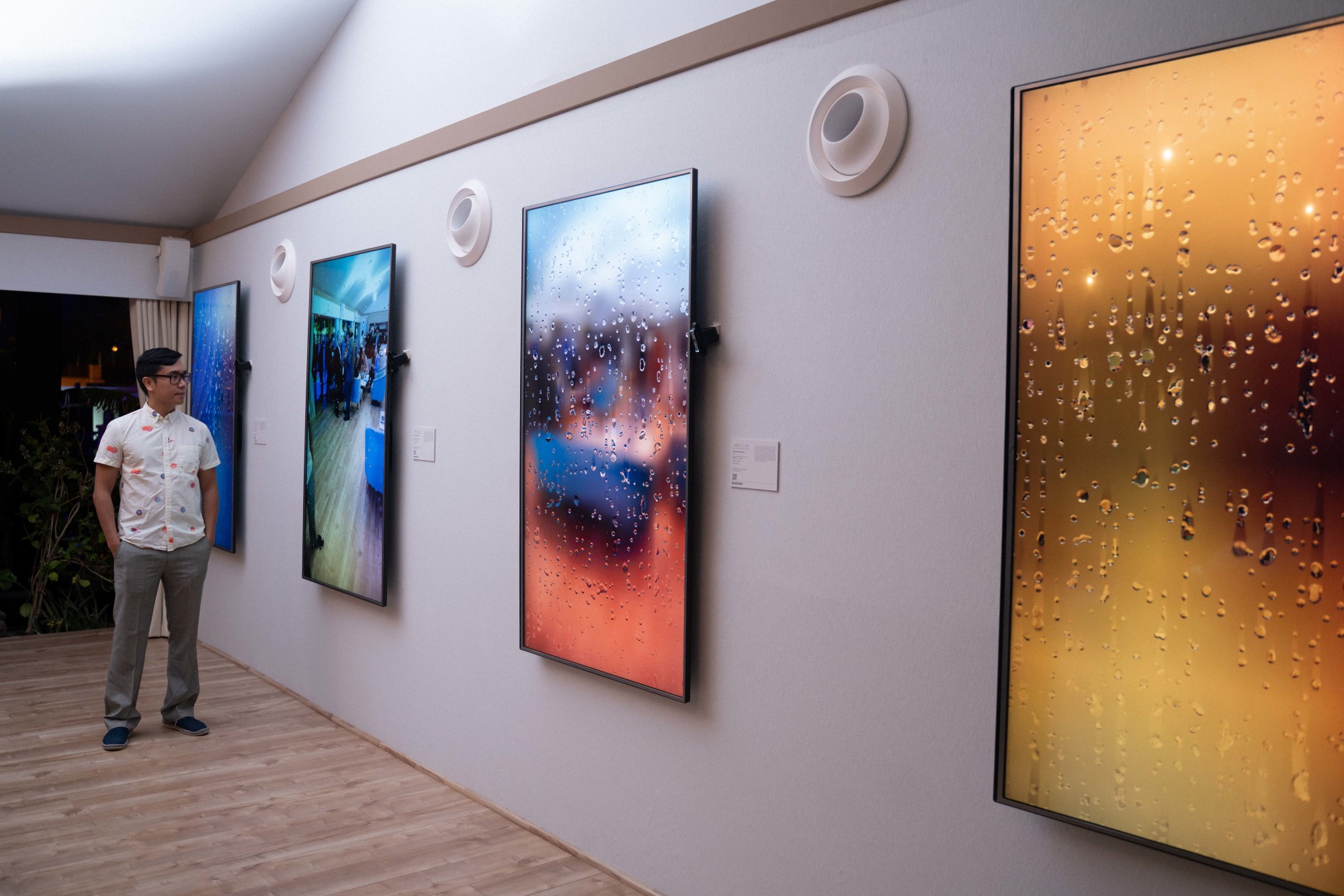 The viewer sees themselves in the screen with raindrops collecting on the surface. The raindrops eventually run down the surface, leaving streaks on the video. All of this is done in realtime using custom programmed software. Visitors can see themselves with- in the raindrops with the image getting blurry as it gets foggier.