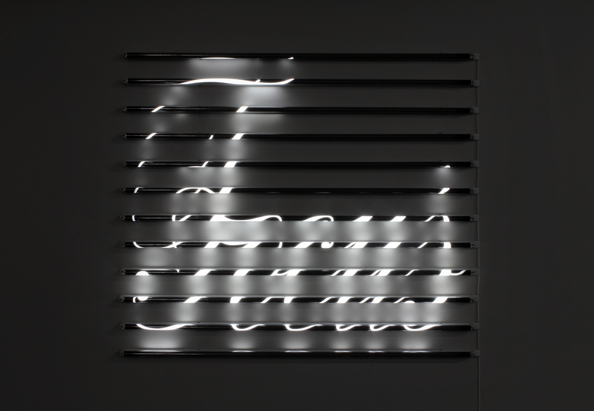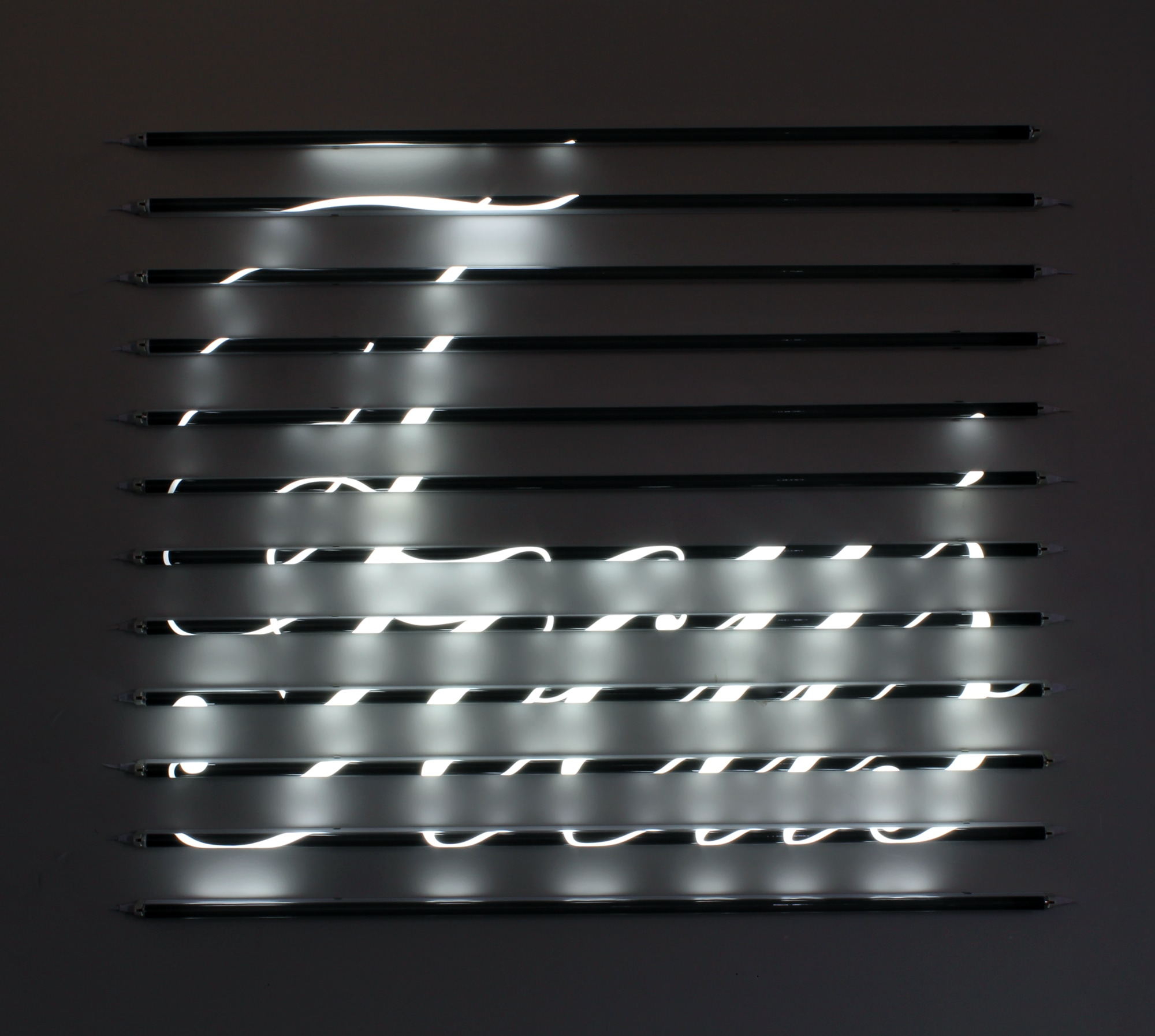 Fluorescent lights are mounted horizontally on the wall. Within the lines of light the word “Focus” is written. Using cursive writing, the line goes from crisp to blurry as the word goes from direct light to indirect light. This causes the lettering to go in and out of focus.