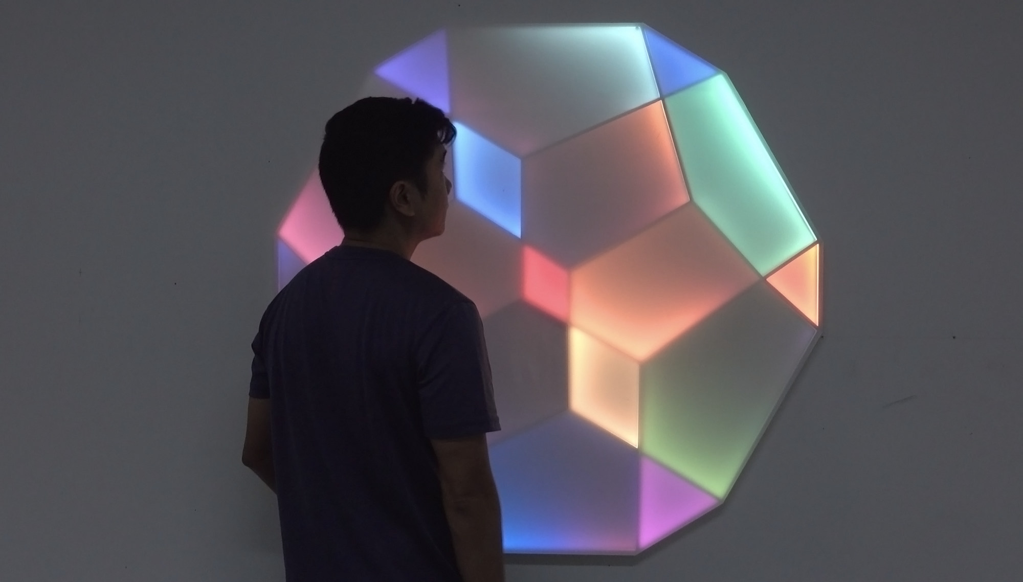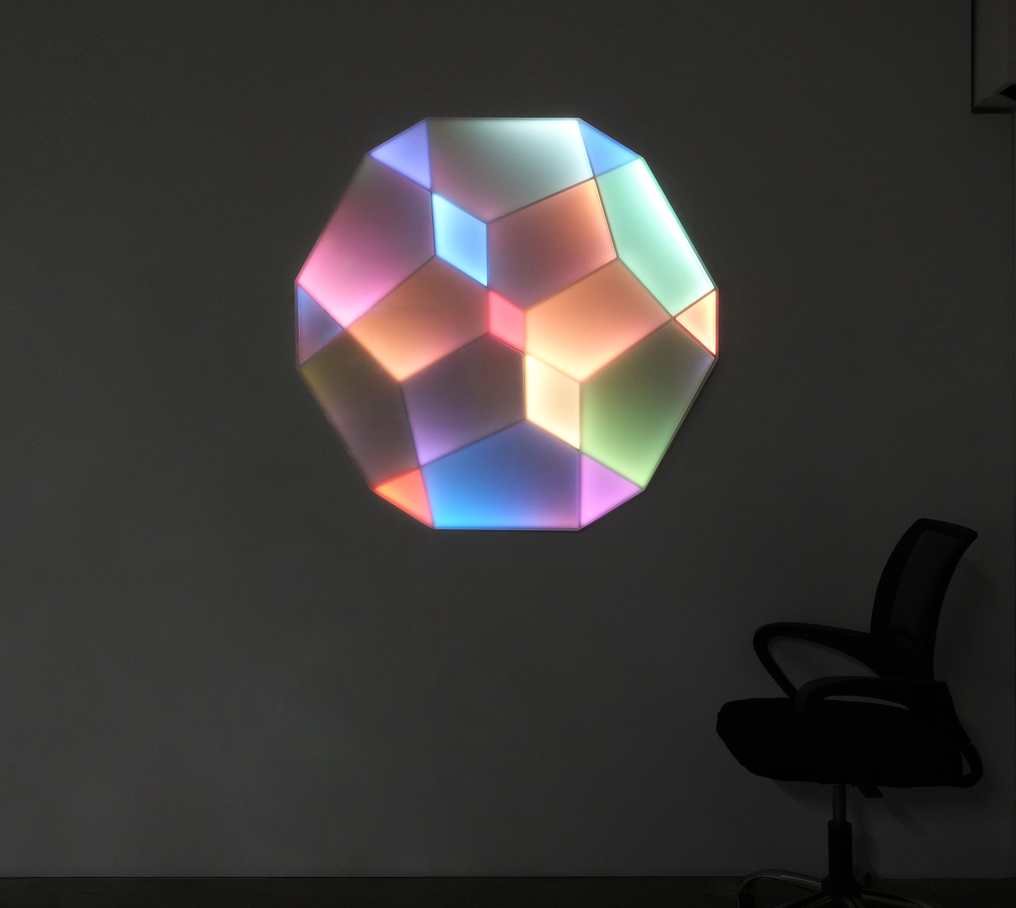 Refraction Sphere is a flat, wall-mounted light work fabricated from metal, LEDs, and color filters. Although physically planar, its segmented light surfaces produce a 3D illusion, reading as a low-resolution sphere. Color gradients and edge-lit transitions move across neighboring panels, suggesting light refracting through a solid material.