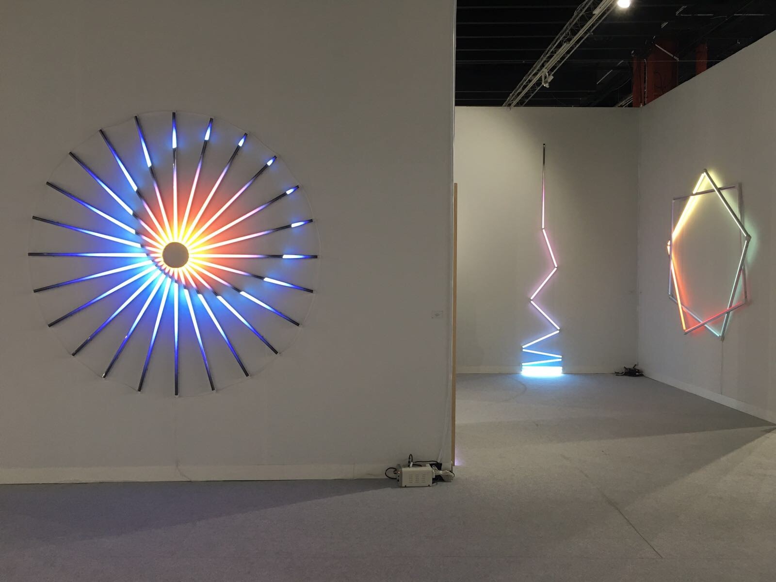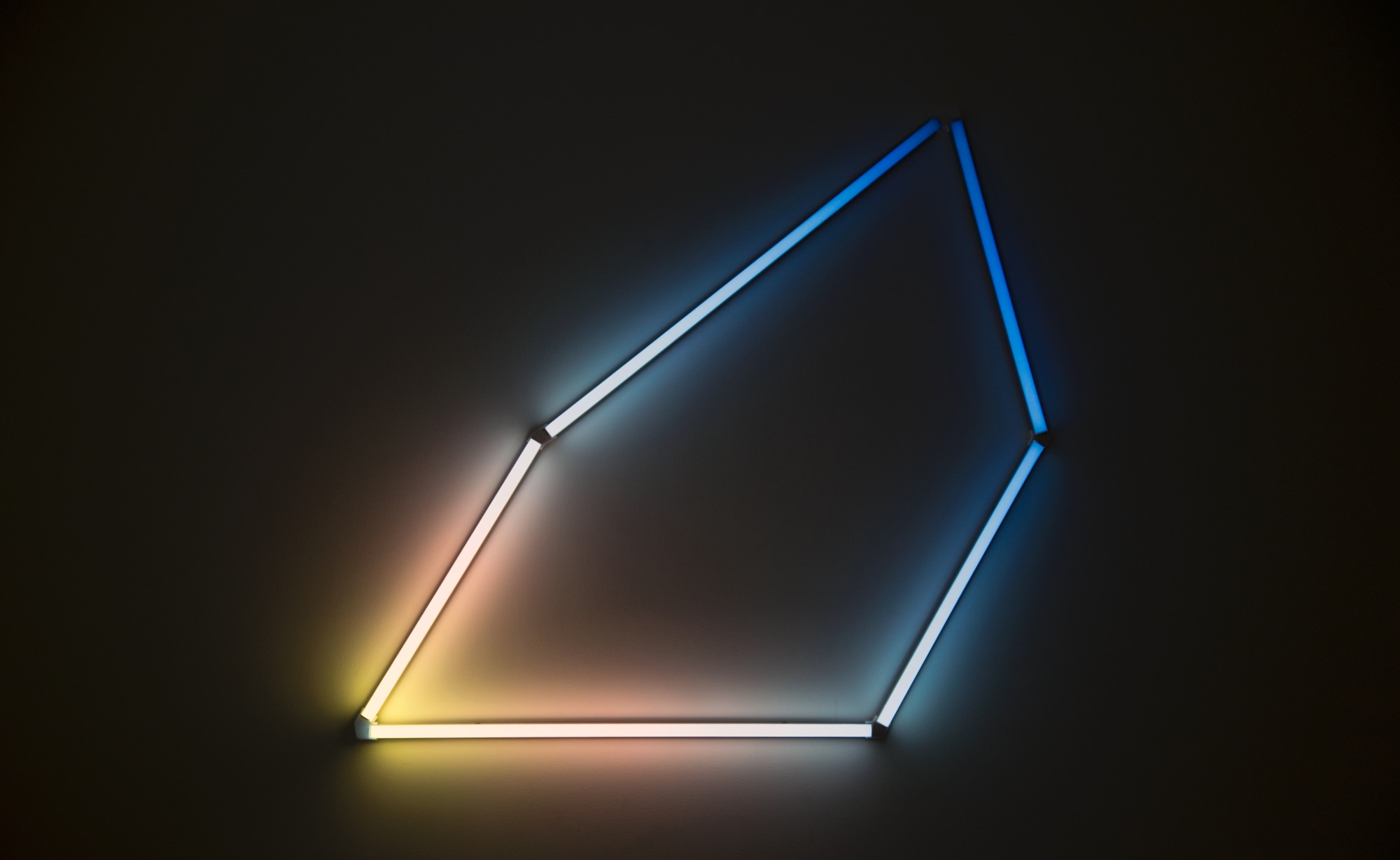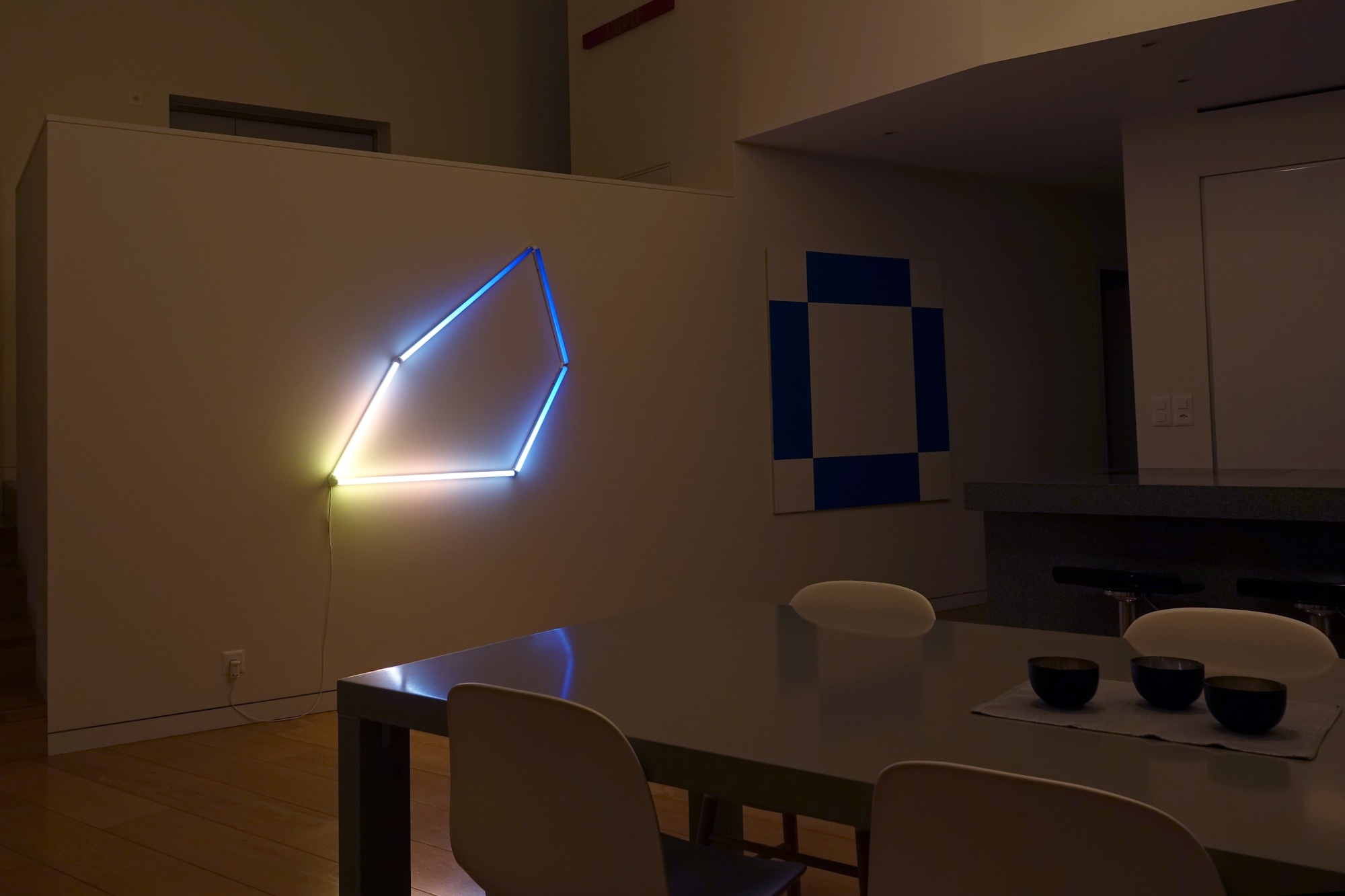 The work focuses not on the physical structure of the house, but the immaterial shadow. It ‘flips’ this dark area and creates it in lights. The color of the lights show the sun setting behind the house.