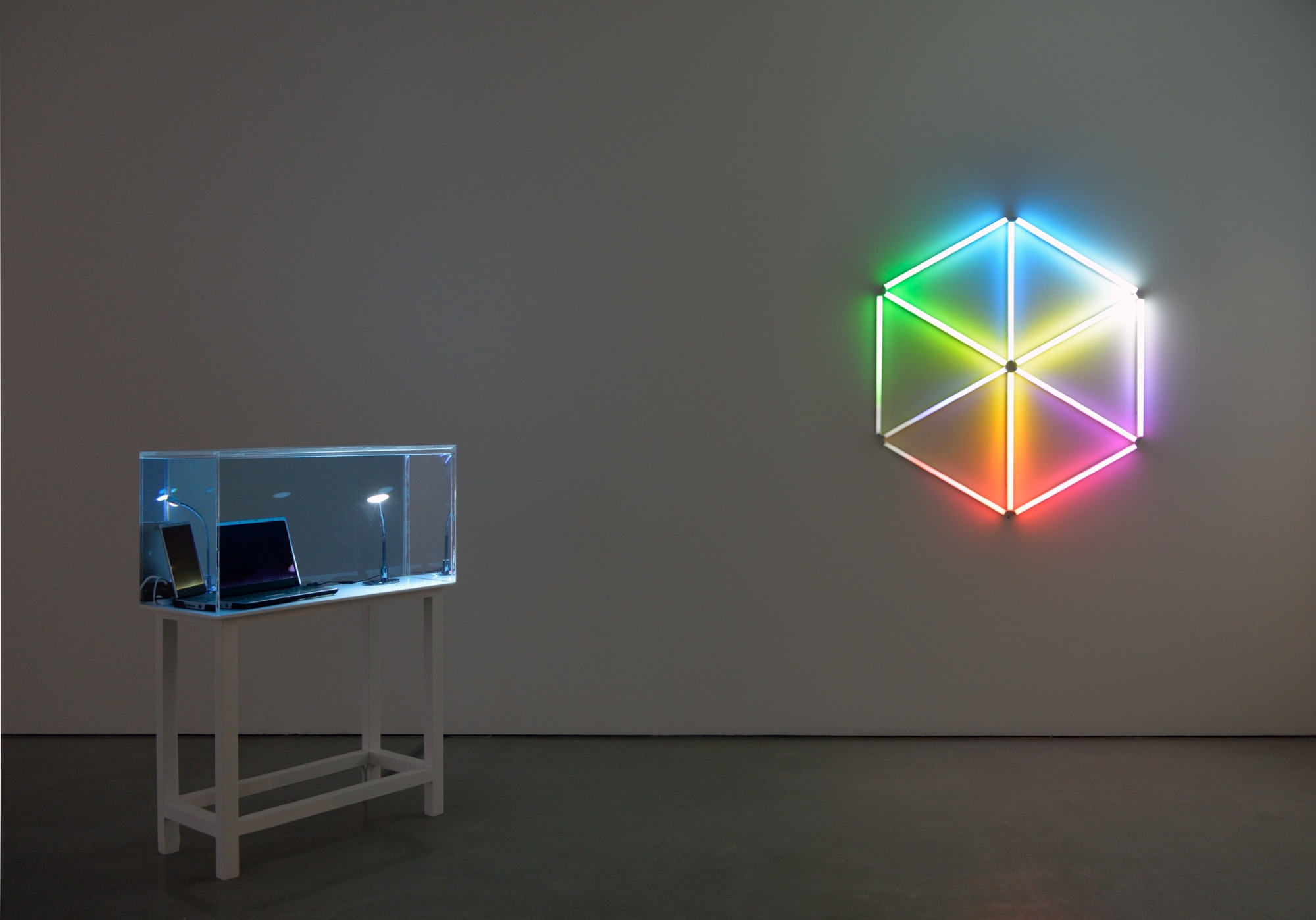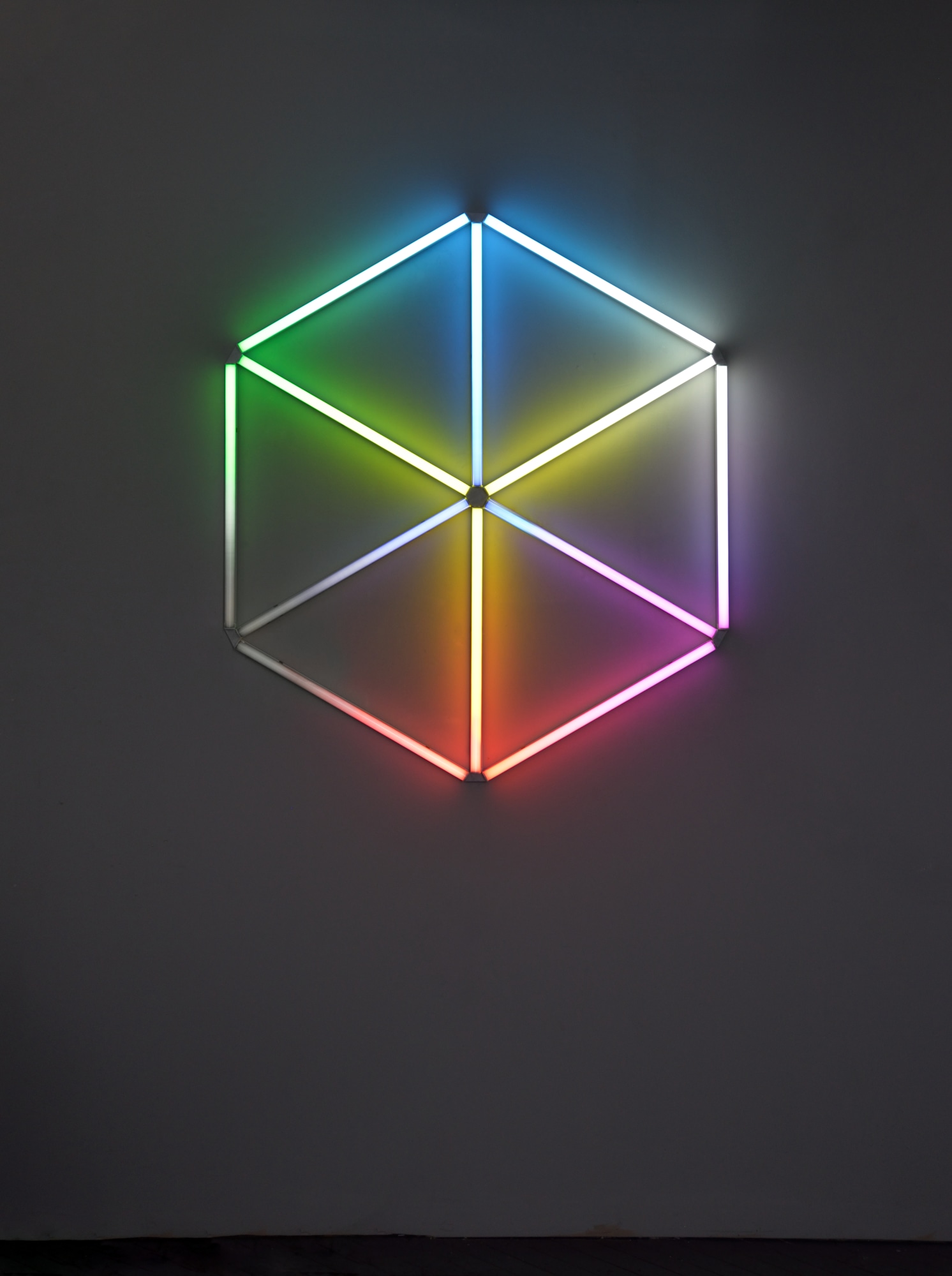 Space Is A Hologram (2014) is premised on the idea of the “space pixel”. A strand of scientific research proposes that the universe’s information may be contained in the same way as pixels on a screen and that the natural “pixel size” of space is roughly 10 trillion trillion times smaller than an atom. Our notions of space and form are thus collapsed into a two-dimensional hologram. Through simple lines of light and color, the work suggests the planes of a three-dimensional cube, prompting the optical illusion of a real spatial cube. The simplicity of triggering this jump between two and three-dimensionality, encourages us to think that perhaps it is not so great a leap to perceive of our reality (3D) experience as conjured from a 2D hologram.