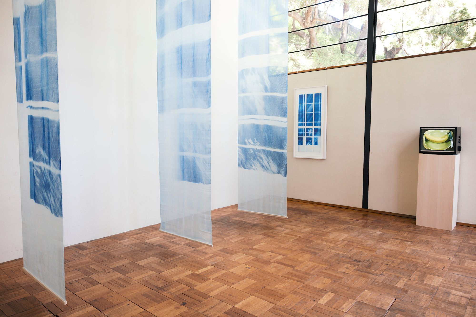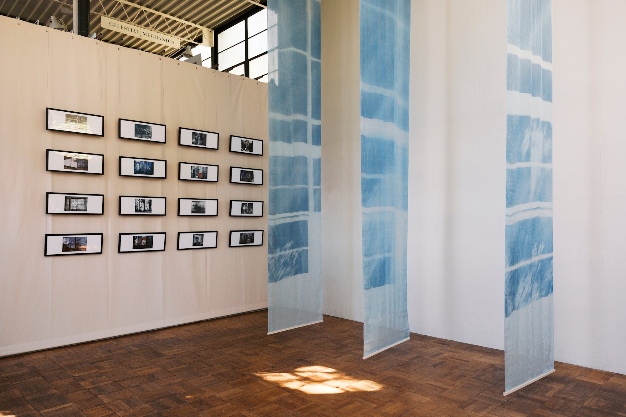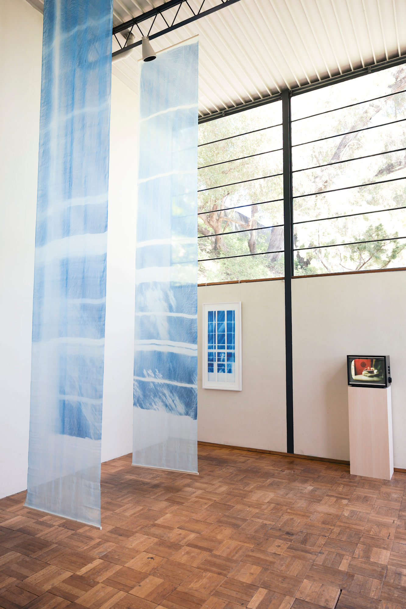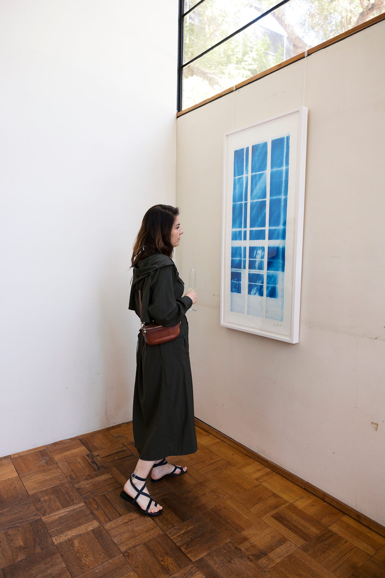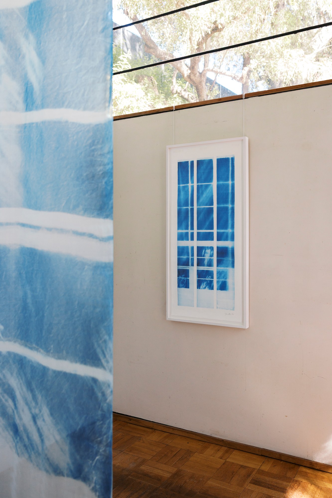 The natural sunlight passing through the Eames House windows was used to expose large cyanotypes. This recreated the outline of their windows on a 1:1 scale. The artist was interested in the unique grid of their windows and how they framed sections of the natural world outside, making the house and its windows a system of measurement. The artist imagined Charles and Ray standing by the windows, looking out, and coming up with new applications of technology whose modernist influence on art, design, and architecture still impact us today.