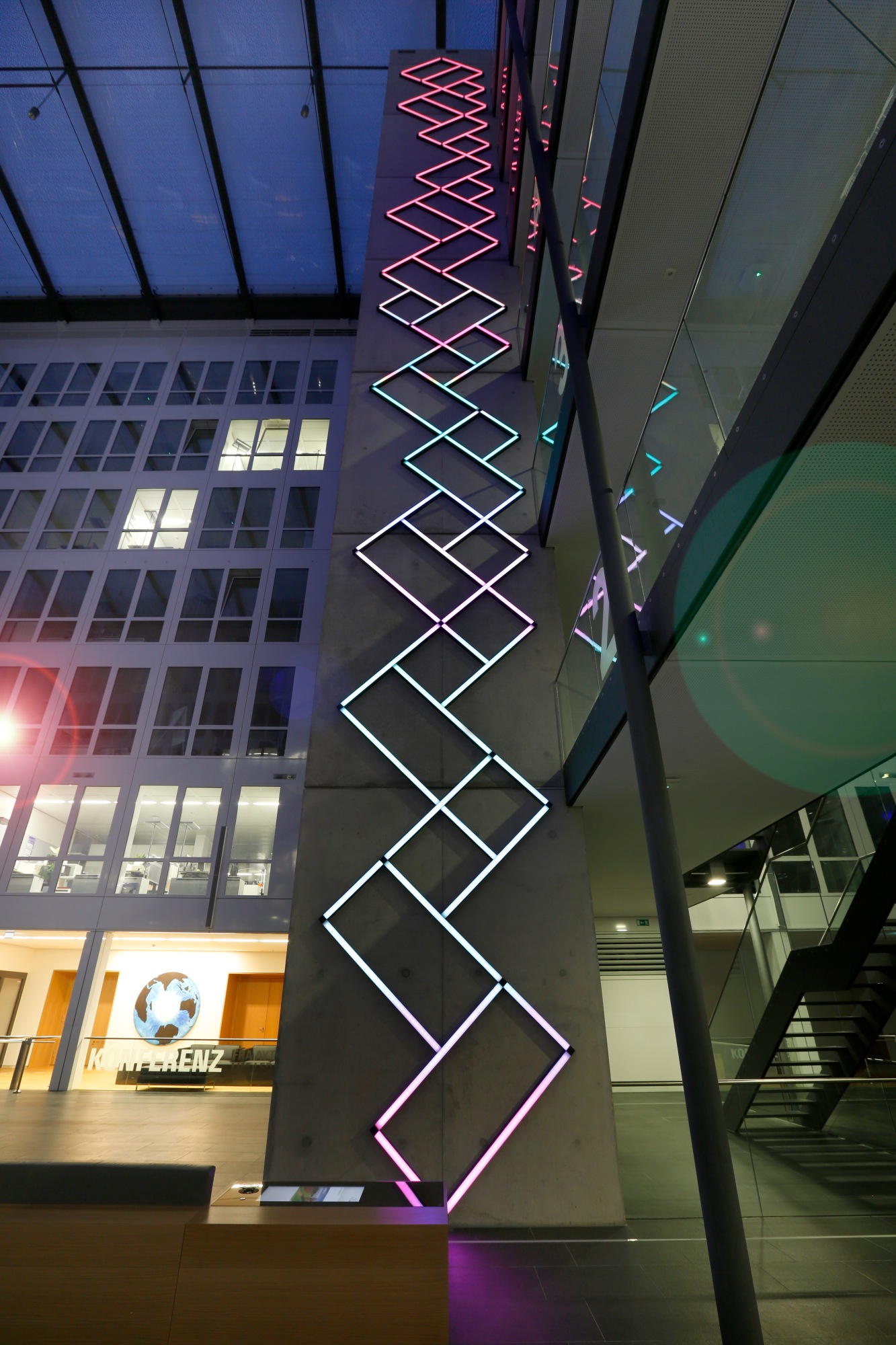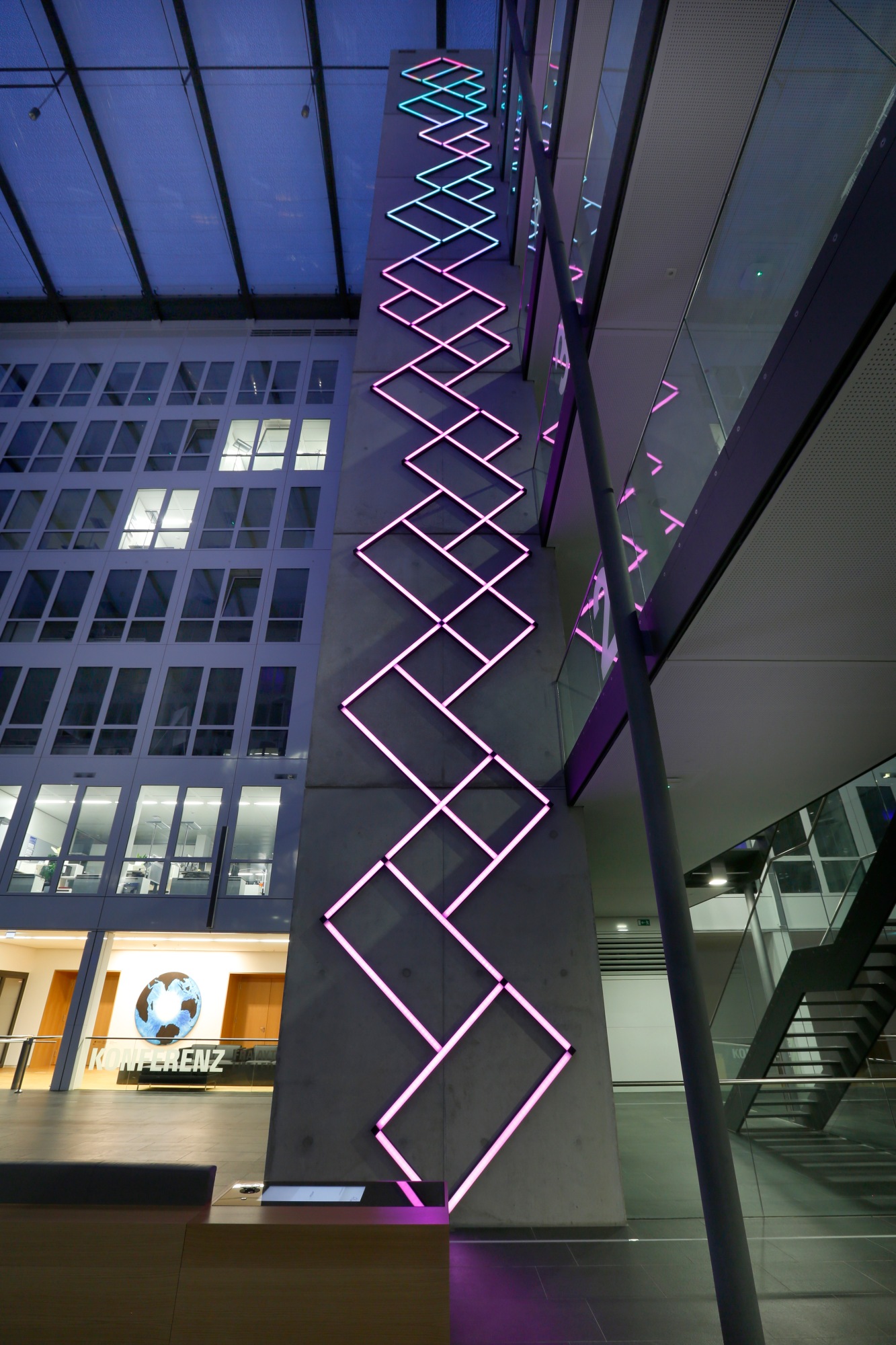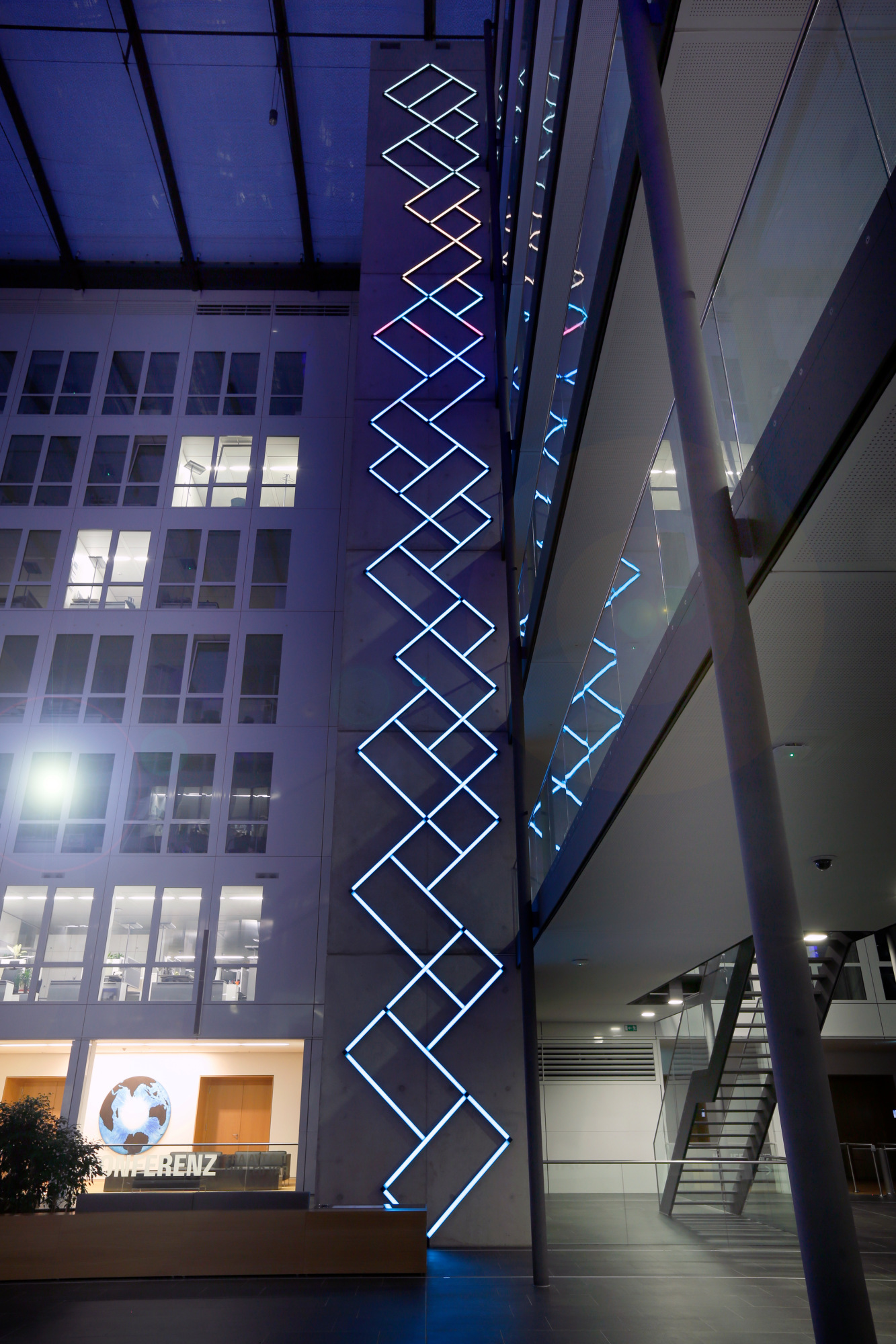 “Synesthetic Timeline” is a permanent installation in the Fraport headquarters in Frankfurt Germany. It consists of two, eight story high, audio interactive light installations that convert live sound into geometric lines of light.