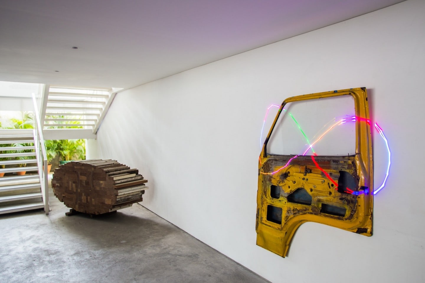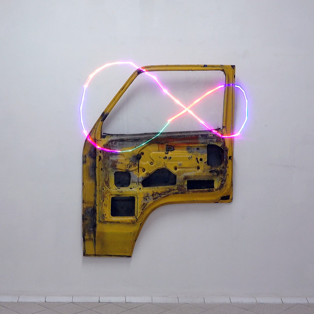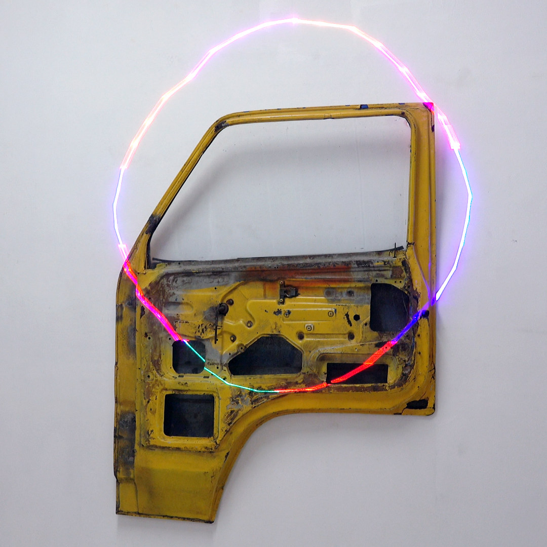 An old metal car door is mounted to the wall with a laser shape that's projected on it. The geometric shape slowly twists and morphs over the open window. It is a visualization of loose thoughts and contemplation, daydreaming as you go for a car ride and stare out the window, the landscape passing you by.