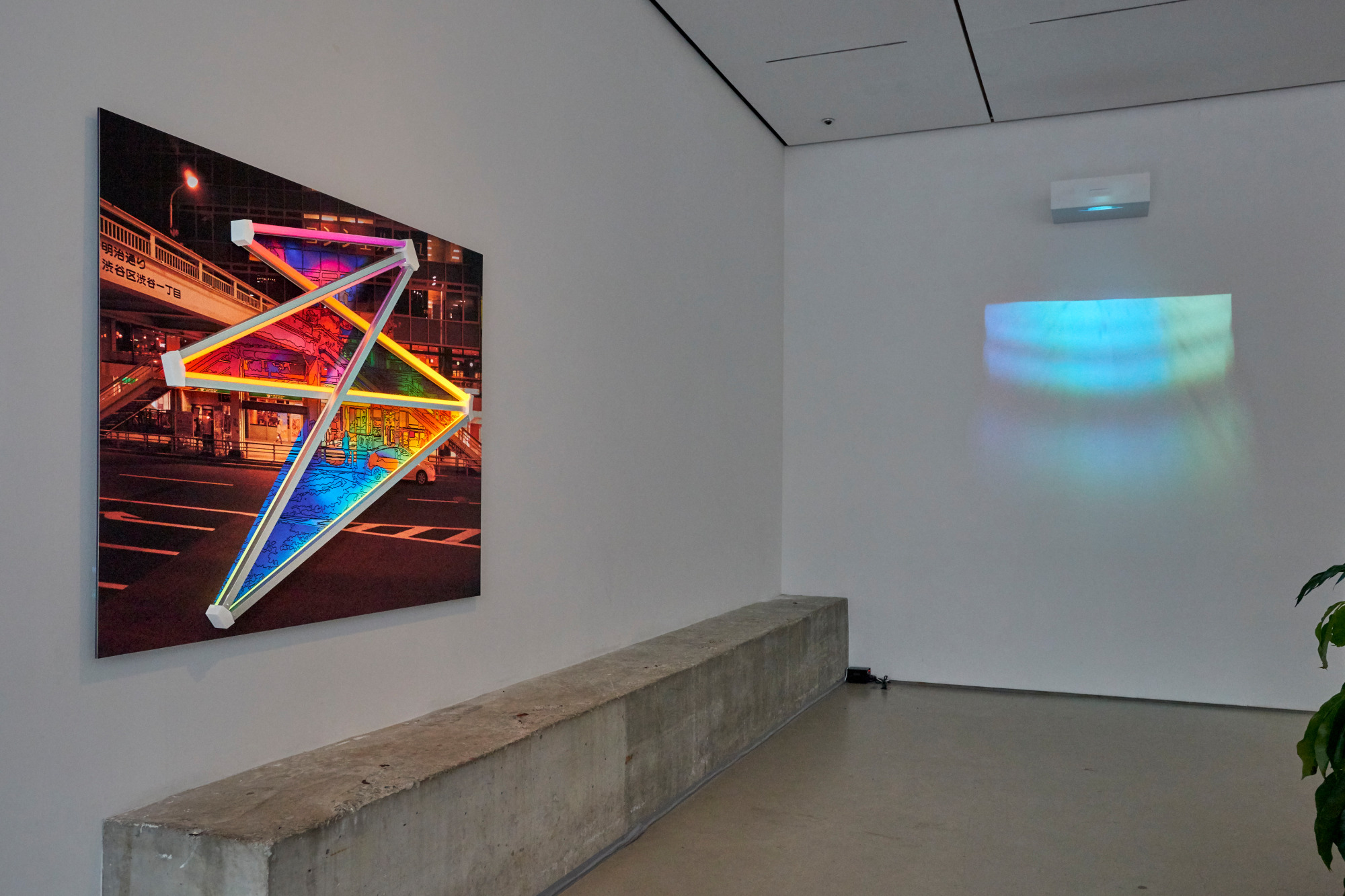 An abstract light structure sits on top of a photographic image and creates portals into other viewing dimensions, portals, or realities of that space.