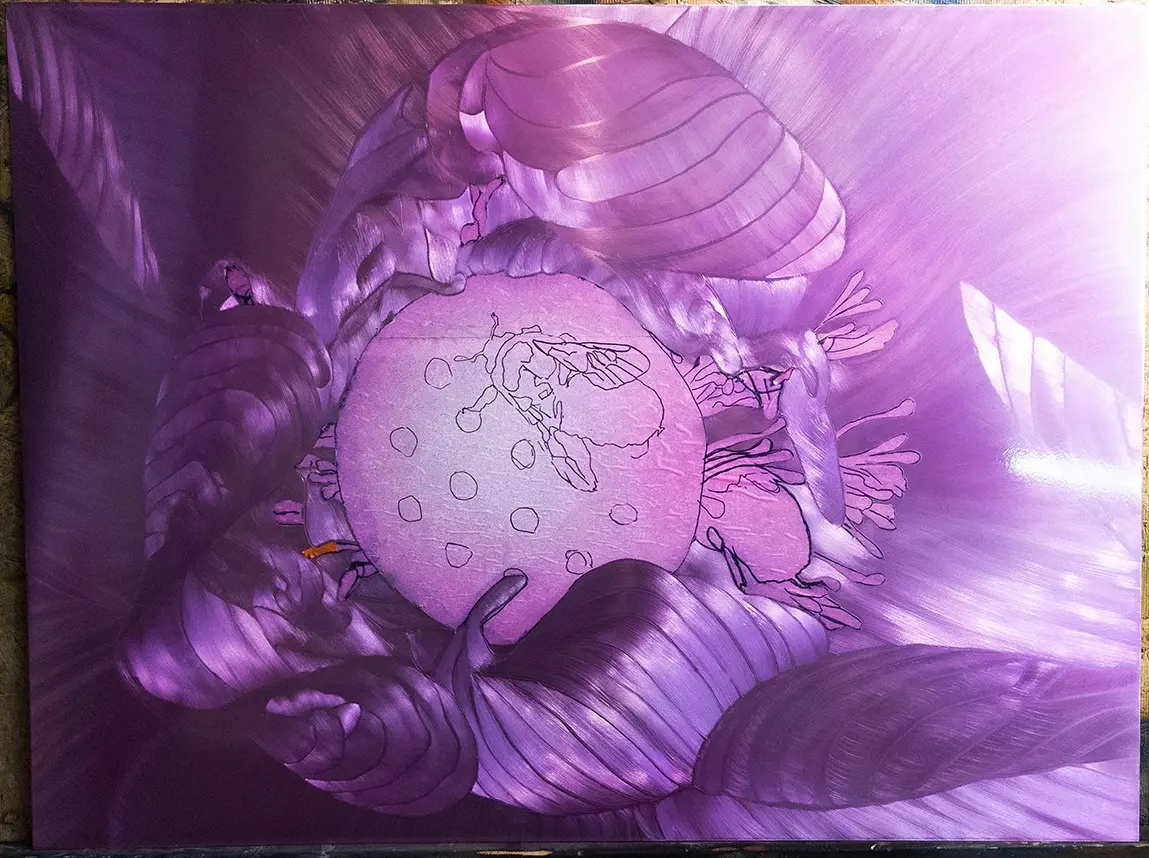 Bellagio Lotus bloom starts out pink turns white in 3 days then falls off. Reference from a photo taken by my wonderful sister Teri Paukert who grows them. After seeing it in person I was struck by its bright pink radiance. The reflective metal technique is a way to convey its other worldly energy and nature. A very radiant peace giving good energy.