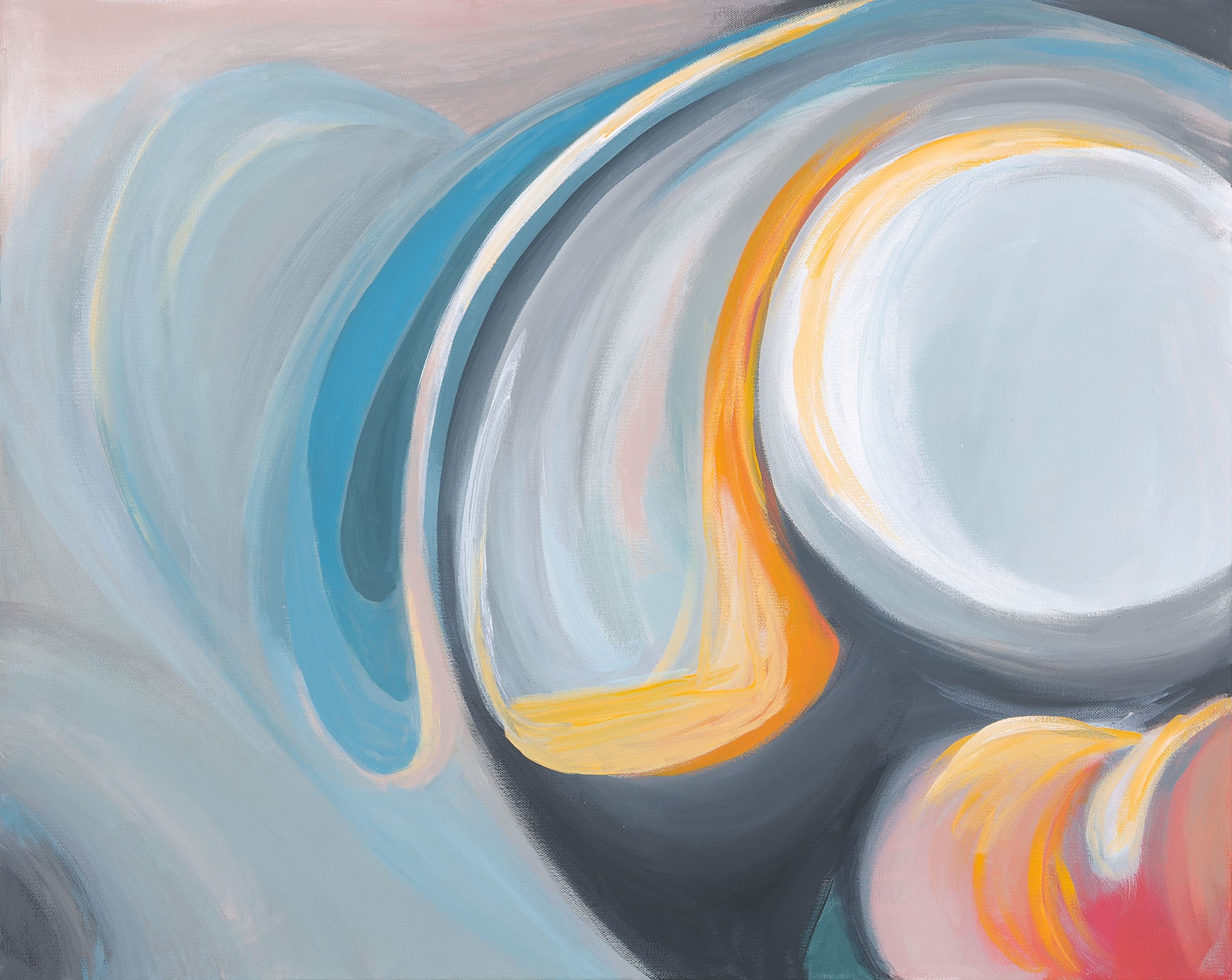 Sweeping shapes and soft shades of blue and gray warm up into rosy pink and warm orange and yellow - just like Winter warming up into Spring.