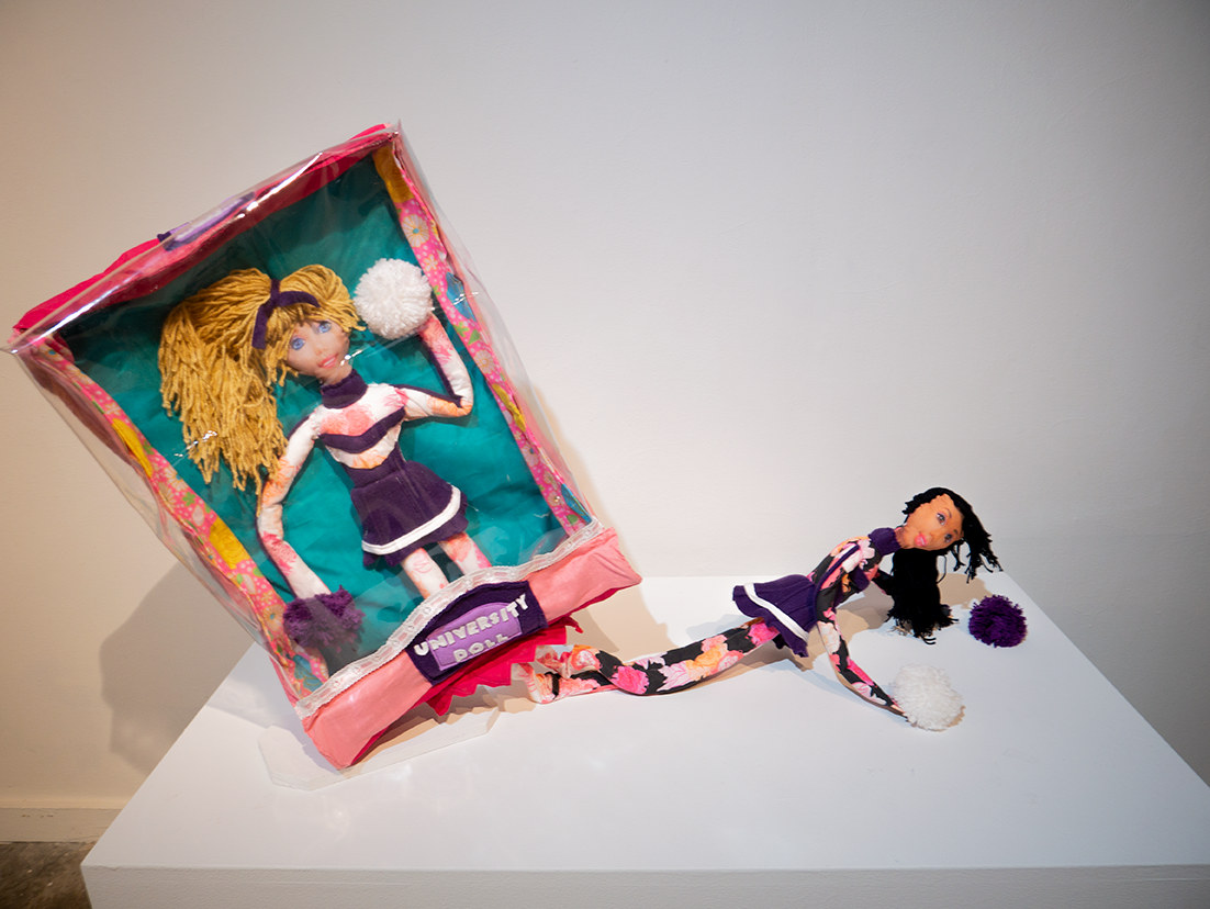 During the artist’s childhood their mom wanted to buy a University Barbie from the school she graduated from but the store did not have a black version of that doll. The store had other black dolls but the artist's mother decided to go ahead and buy the white doll since it still represented her school. Over two decades later the black version of this doll appeared in a thrift store. Revealing that a black version of this doll always existed but that store decided to not order stock of it.