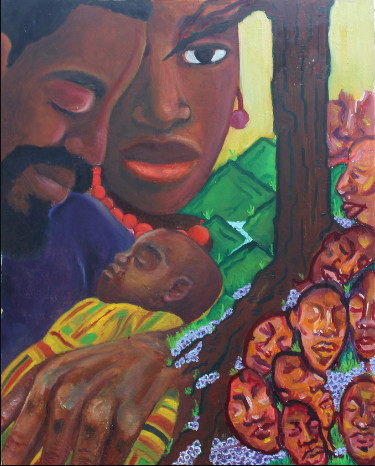 Jay Golding, a Jamaican-born Accompong Maroon descendant raised in the U.S., paints vibrant works explore the infusion of Caribbean and African motifs.