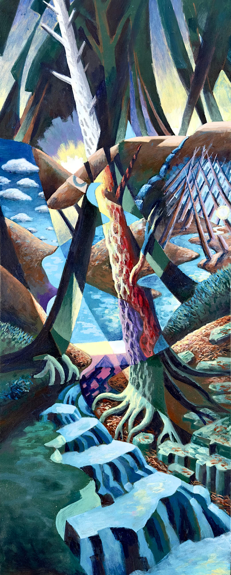 Three interwoven views of a mountain stream.