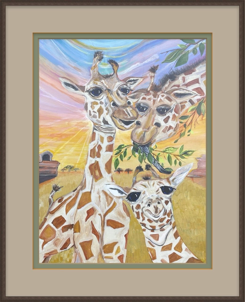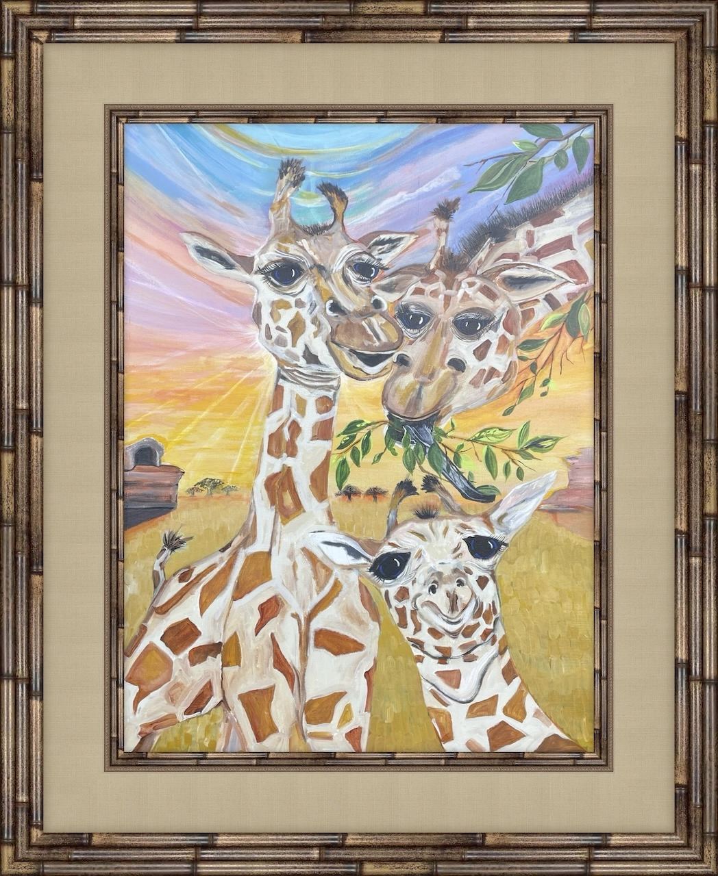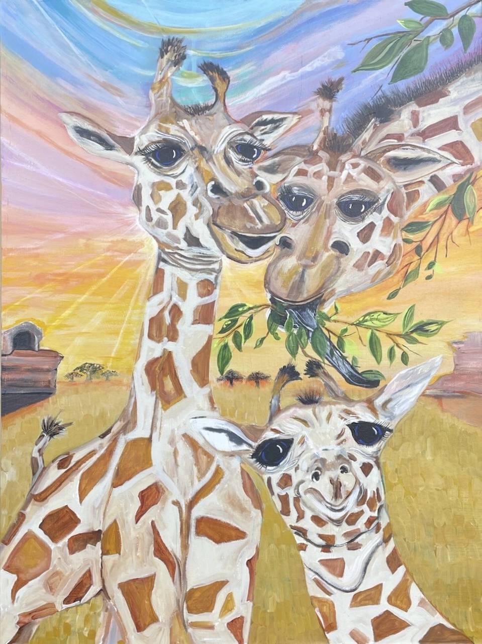 This painting captures the essence of a giraffe family … father, mother, and their playful calf … set against the vivid sky and African savannah. Giraffes, known for their height and unique spots, thrive in the wild, eating up to 75 pounds of leaves daily and only drinking once every few days, obtaining much of their water from the plants they eat. Their long necks help them reach leaves high in acacia trees, and their gentle demeanour is reflected in this touching family scene.