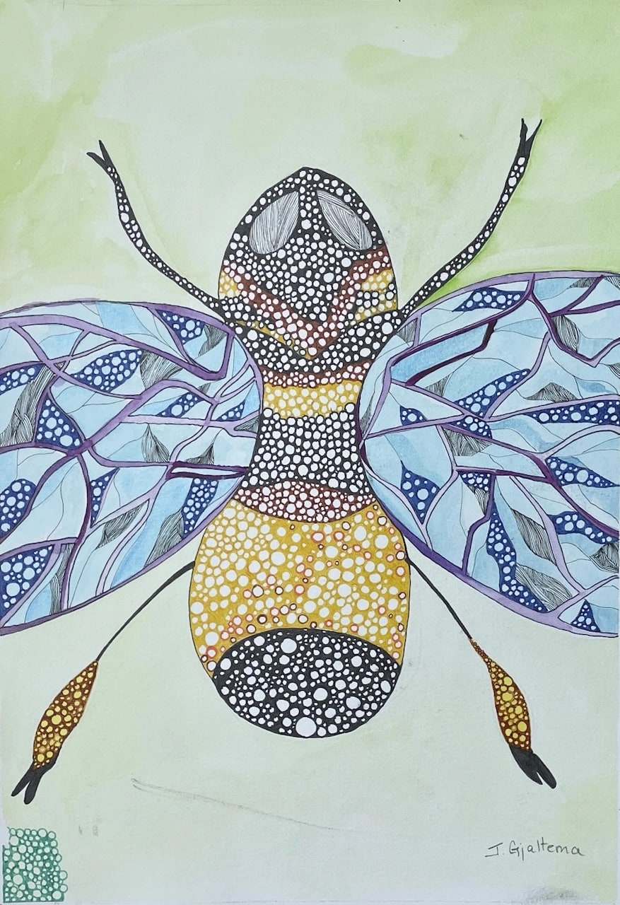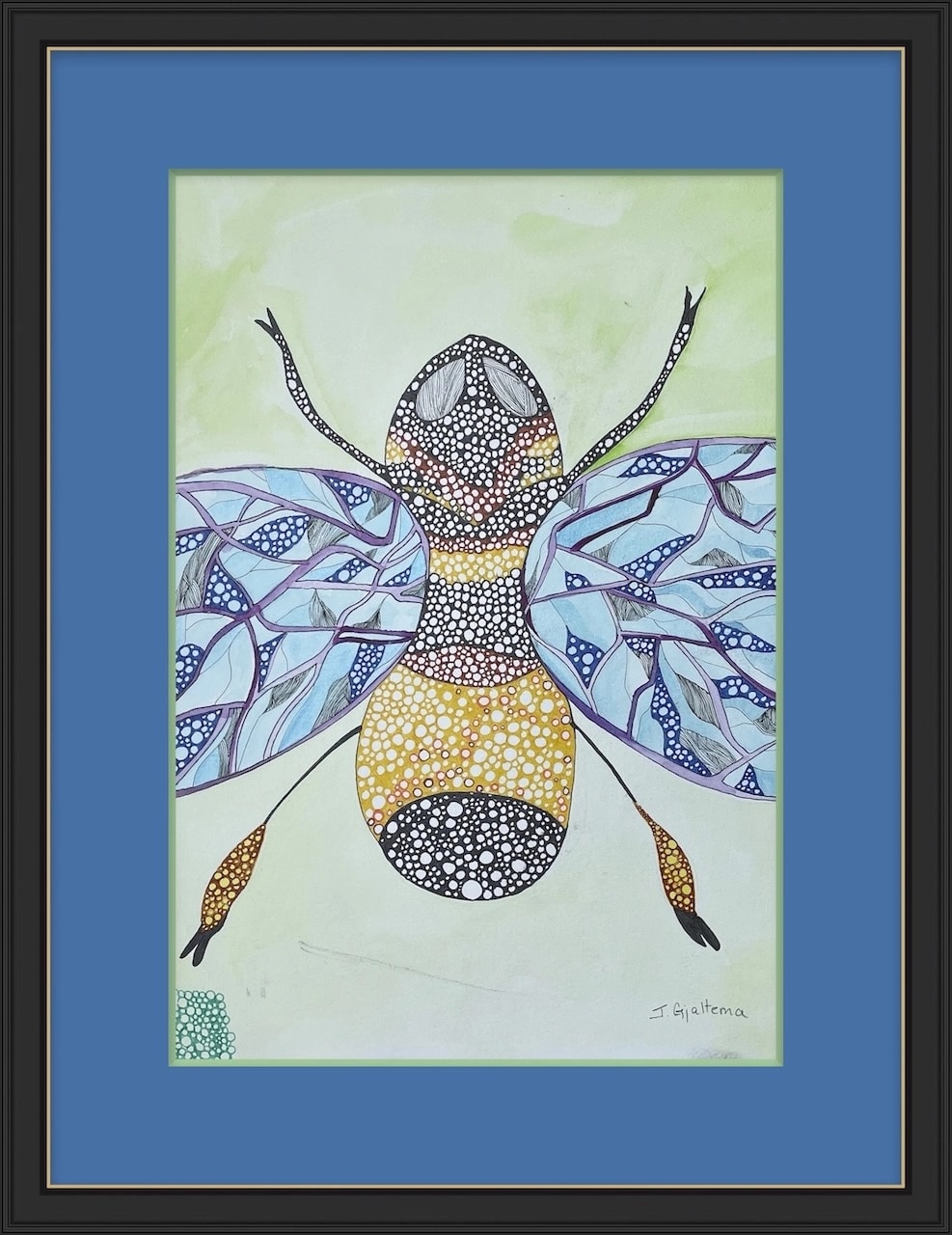 Inspired by a fleeting encounter with a tiny visitor to the studio window, this painting showcases an abstract interpretation of a delicate insect … blending bold black and gold tones with intricately detailed, transparent, blue wings. Set against a soft green backdrop, the watercolour captures the curious beauty of the unknown insect, inviting viewers to marvel at the delicacy and complexity of nature. It’s a piece that embodies the joy of observation, translating a simple studio daydream into vibrant art. This piece captures the artist’s fascination with nature’s unexpected moments.