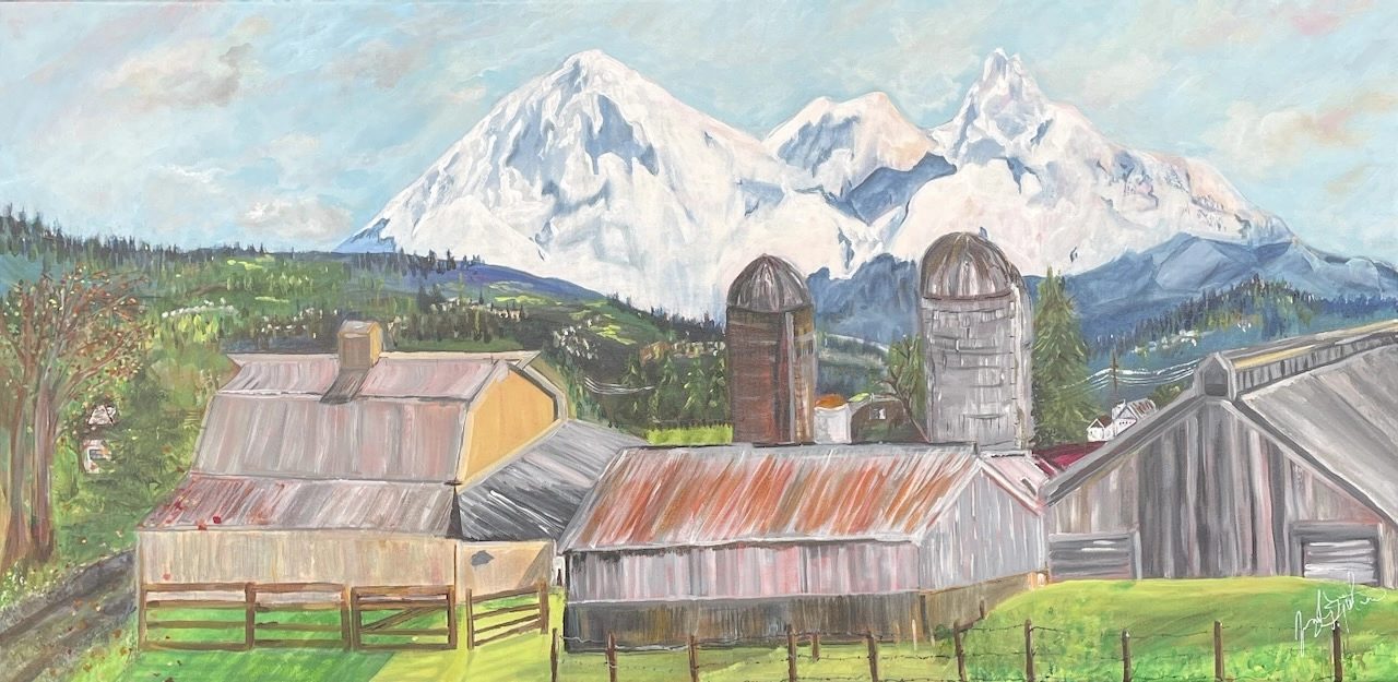 This captivating painting, measuring 40 inches wide by 20 inches high, presents a serene and realistic portrayal of Mount Baker as observed from a picturesque farm in Abbotsford. The foreground of the painting is dominated by a collection of farm buildings, each carefully detailed to showcase the charming rural architecture. These structures, with their rustic appearance, are nestled amidst lush fields and patches of greenery, evoking a sense of peaceful rural life.